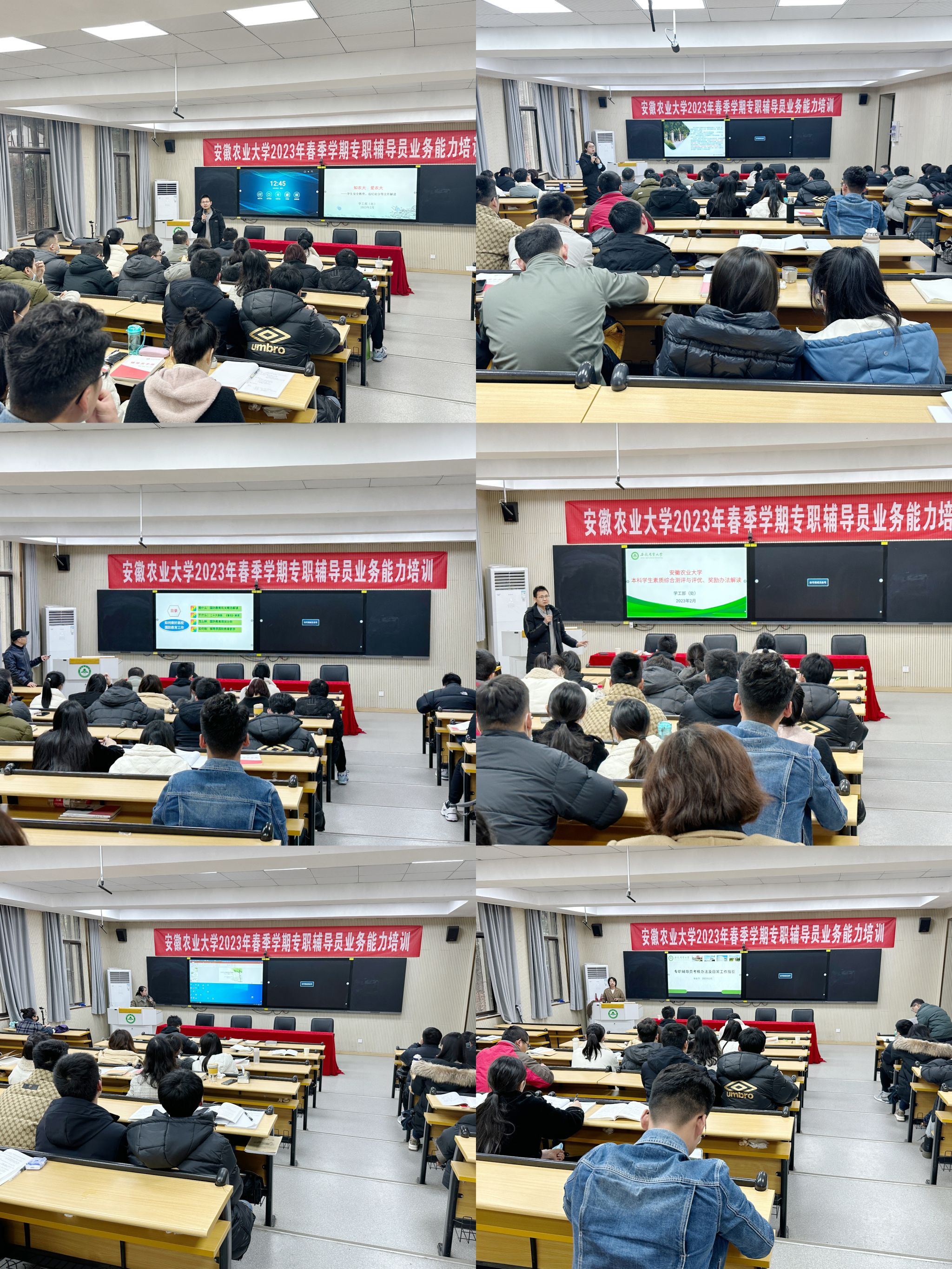 本次培训围绕《知农大爱农大——学生安全教育、违纪处分等文件解读》、《构建多维资助体系、助力困难学生成才》、《如何做好高校国防教育工作》、《安徽农业大学本科生素质综合测评与评优、奖励办法解读》、《大学生心理健康教育课程“1+1”解读》、《专职辅导员考核办法及日常工作指引》等内容展开。进一步提升辅导员的思想政治素质、业务素质和综合能力,确保学生教育管理工作落地落实,推动我校大学生思想政治教育工作高质量。