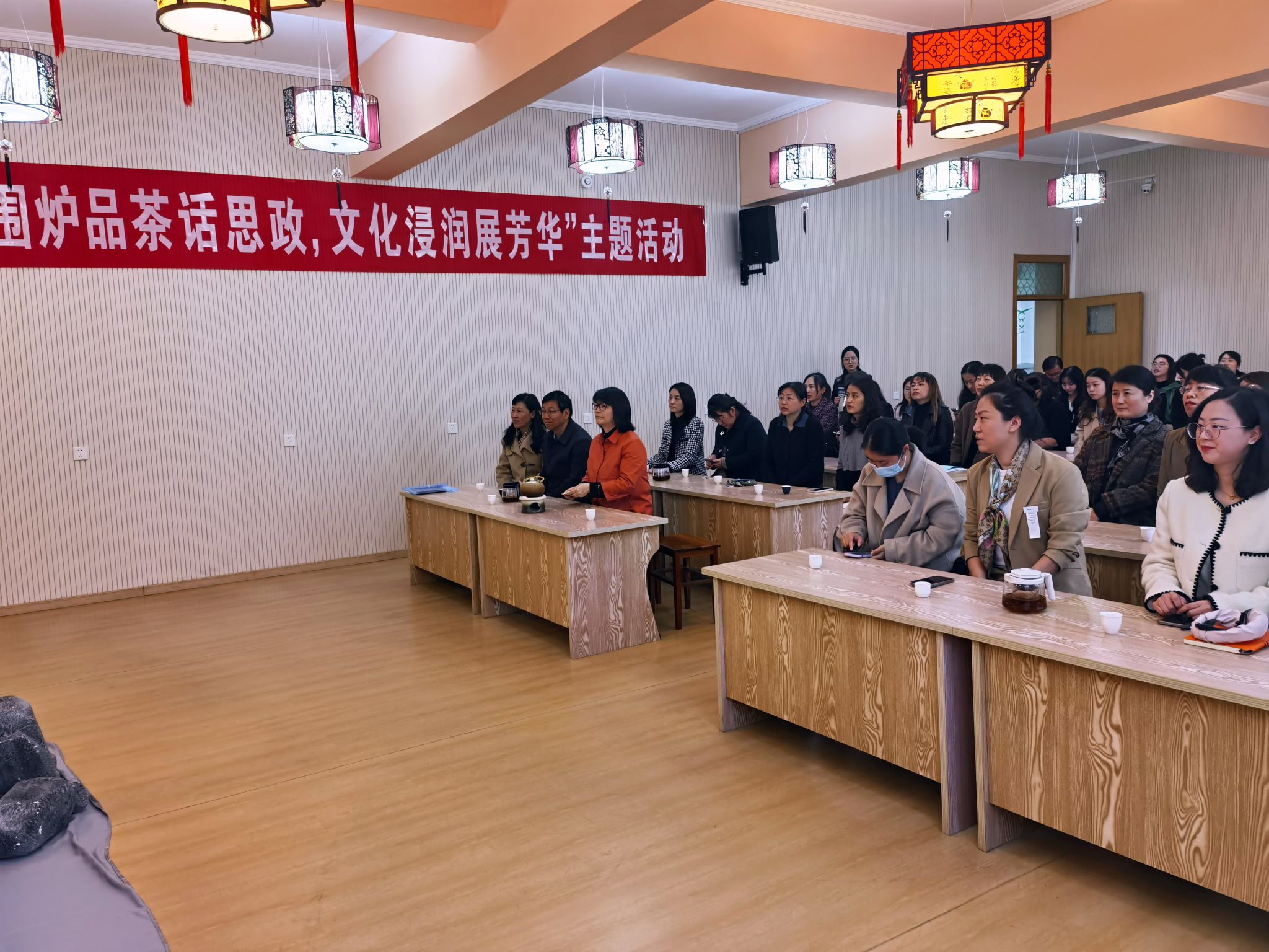 本网讯 为庆祝“三八”国际劳动妇女节,3月7日上午,学工系统在茶叶楼316茶室举行“围炉品茶话思政,文化浸润展芳华”主题活动,校党委副书记裴树东到会指导并向学工系统女教职工致以节日的问候,学工部、研工部、招就处、国合处、团委及各学院女专职辅导员共计50余人参加活动。