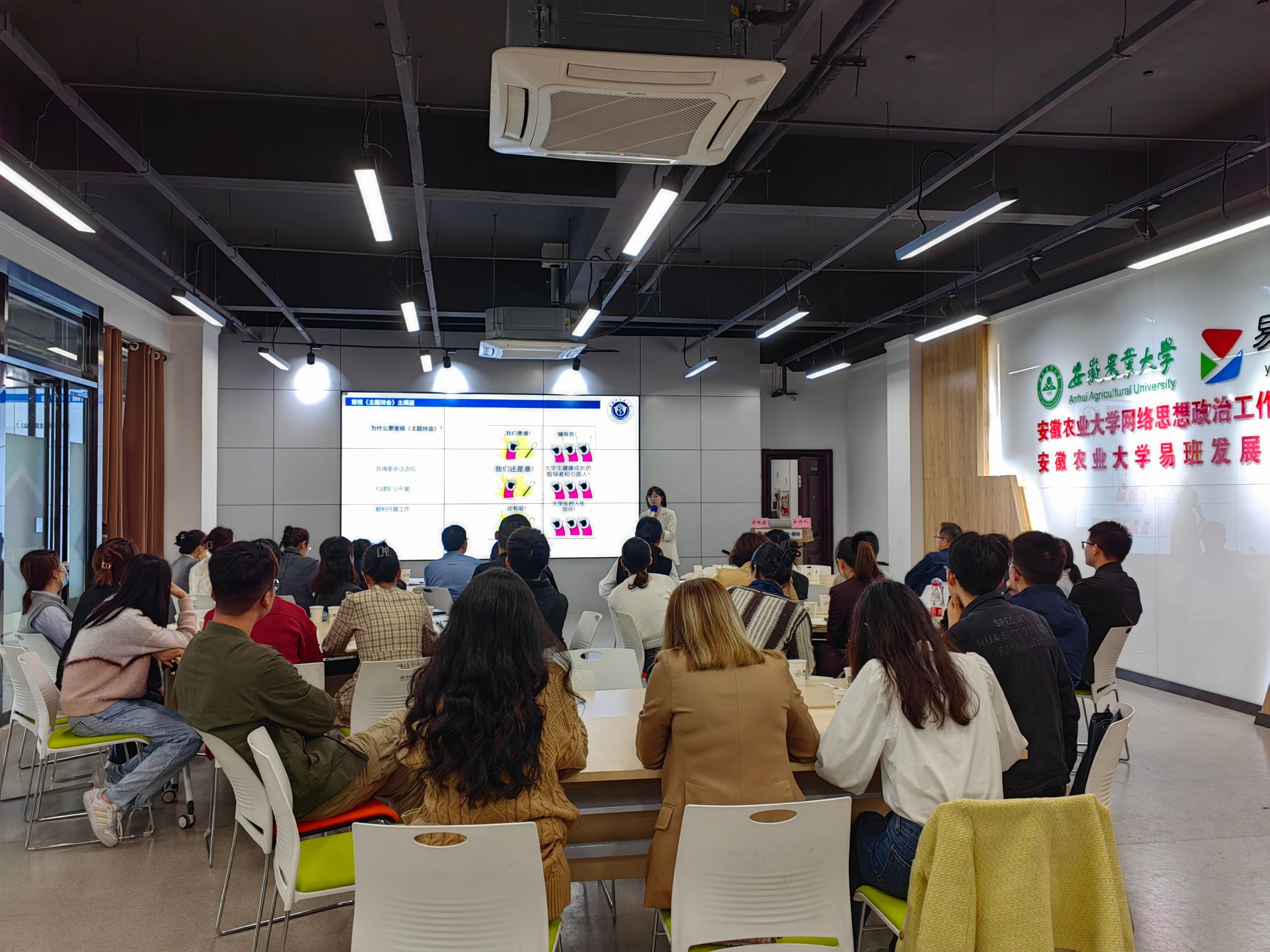次日,学工部(处)邀请理学院党委副书记张志平和安徽省最美辅导员、安徽中医药大学方林莉老师在易班发展中心围绕“如何开展主题班会”为辅导员们呈现了一场生动实用的辅导员沙龙。张志平以“主题班会的设计”为主题,从主题班会的基本理论、设计原则以及教案撰写三个方面进行了分享,强调要结合学生特点、学校实际,打造“农”字开头的好主题班会。方林莉老师以“从《主题班会》视角谈高校辅导员素质能力提升”为主题,主要从主题班会课程的设计和辅导员素质能力大赛的经验分享,强调主题教育要全过程贯穿学生大学四年的学习生活和成长成才中,分享了自身的辅导员素质能力大赛经验及心得体会。