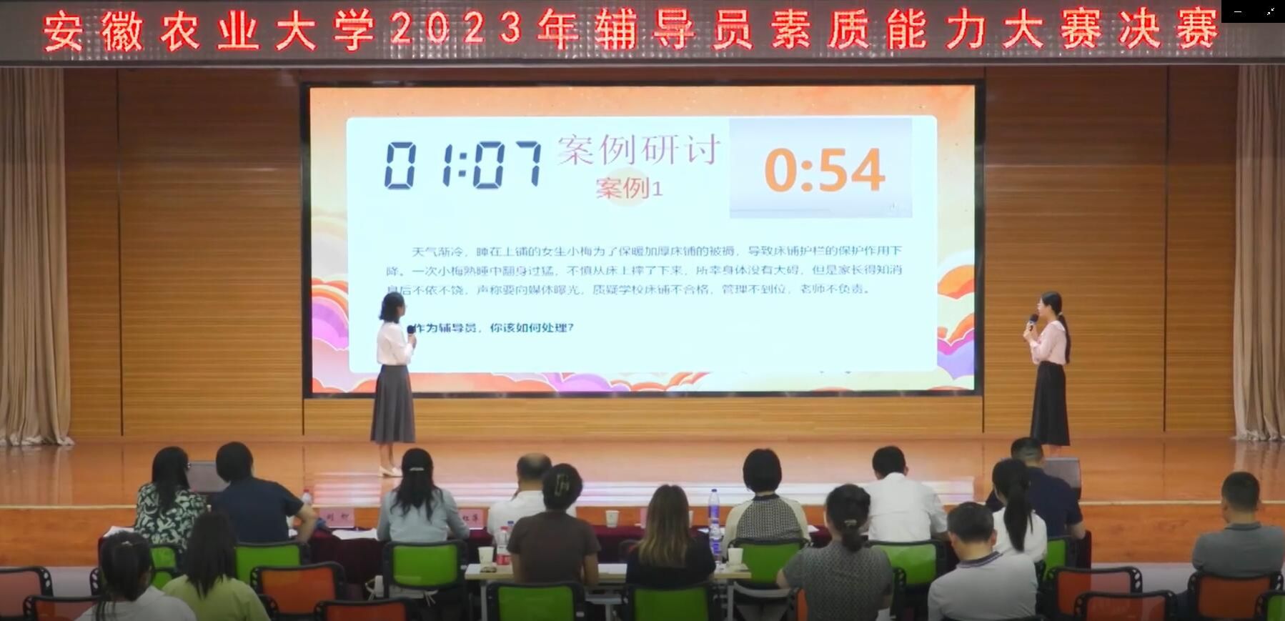 在谈心谈话环节,选手们和助演人员围绕抽中的案例进行角色扮演,这一环节,选手们针对抽中的题目,准确把握大学生思想政治教育理论和对策,善于抓住学生特征,运用娴熟的沟通技巧,通过谈心谈话发挥对学生的教育引导作用。在案例研讨环节,选手们分饰AB角,以“我提问,你回答”的方式对抽中的案例共同进行研讨,辨析原因、研讨对策、总结规律,展现了辅导员扎实的理论功底、丰富的实践经验和良好的精神面貌。