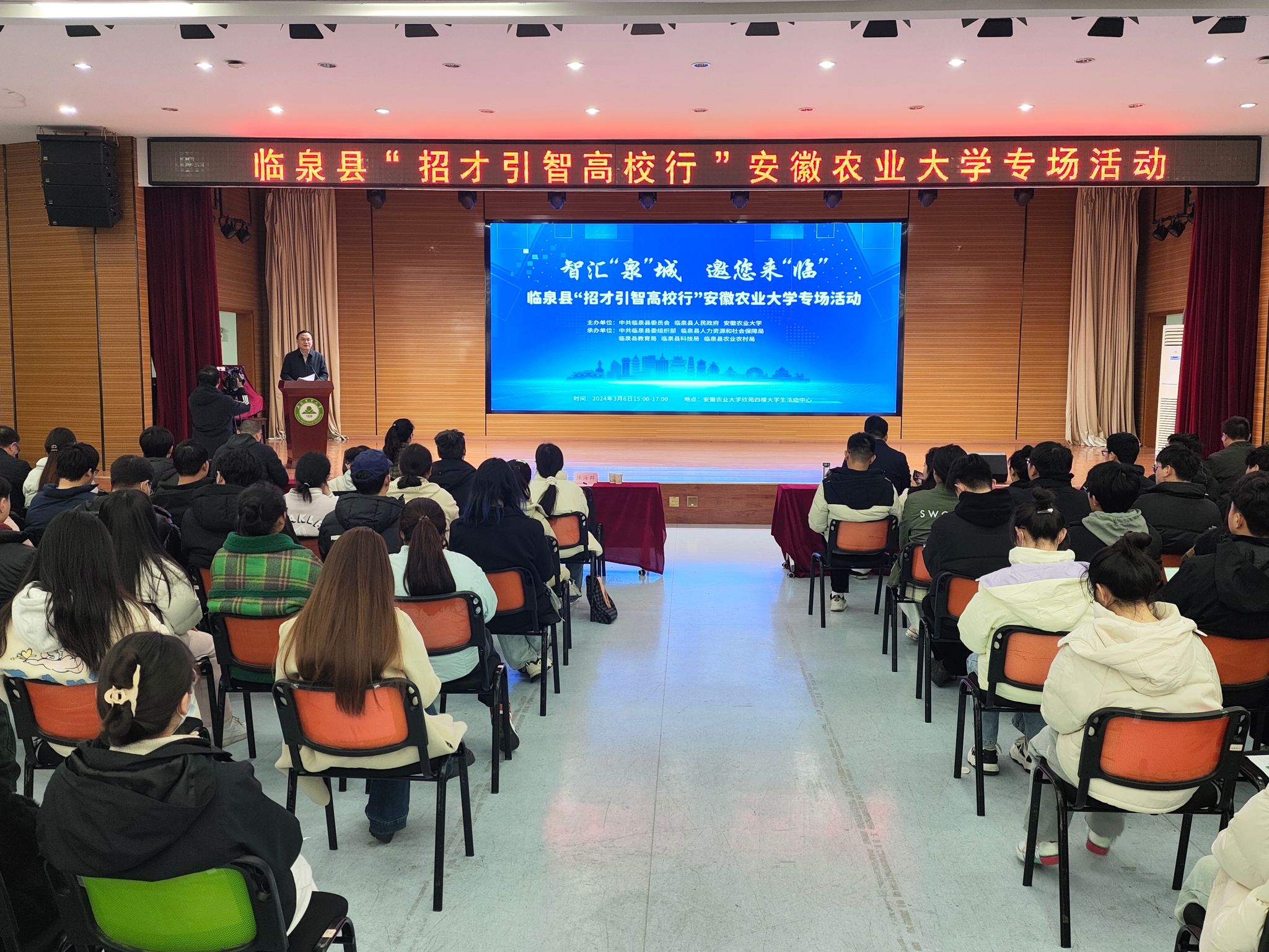 3月6日下午,临泉县2024年春季“招才引智高校行”活动在我校举办。校党委常委、副校长操海群、临泉县县委书记江利国出席活动并致辞,校学生处和校皖西北综合试验站负责同志参加活动。活动由临泉县县委常委、组织部长寿军主持。
