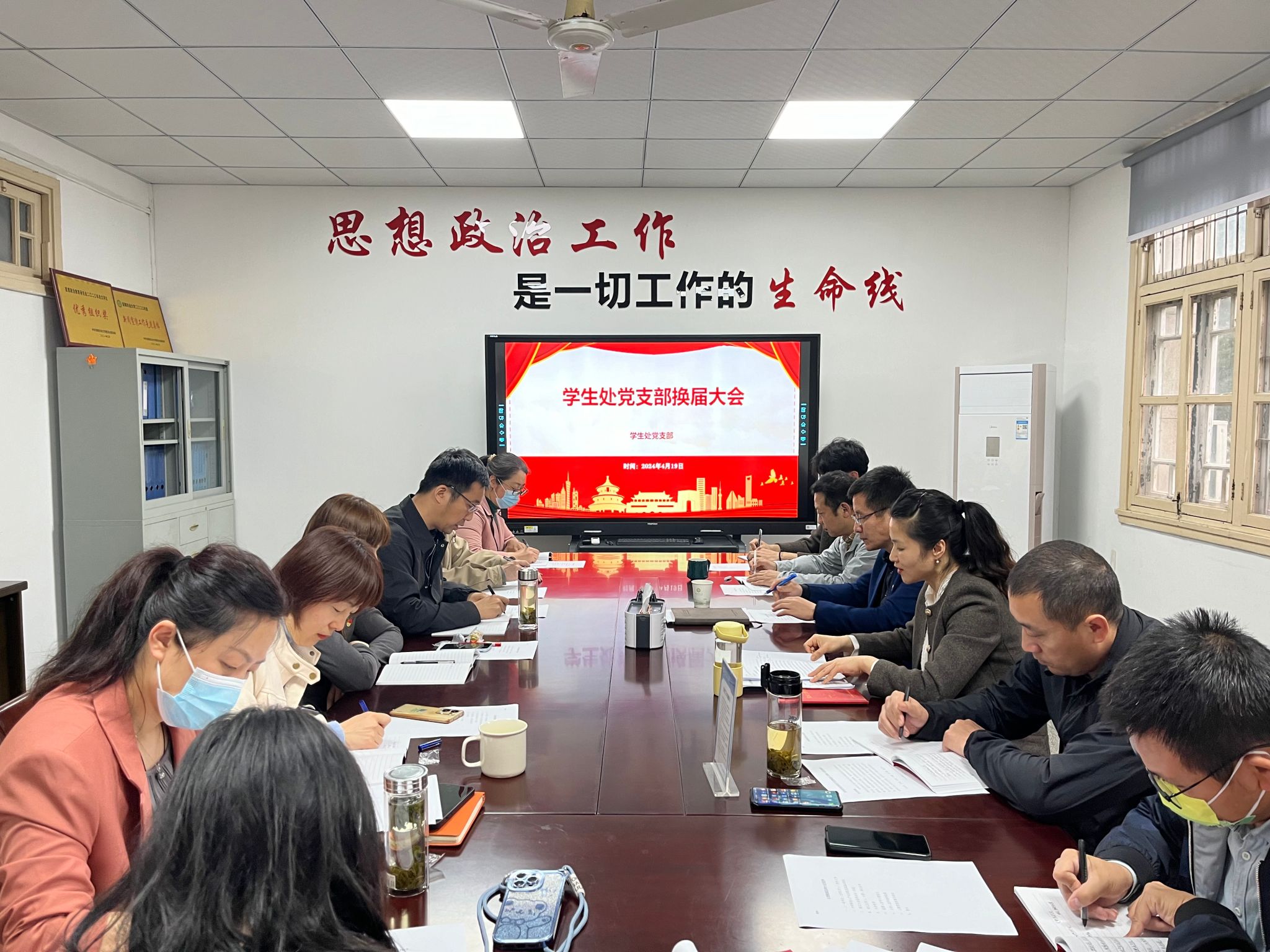 本网讯 4月19日下午,学生处党支部在勤政楼224会议室召开党员大会,进行支部委员会换届选举,支部全体党员参加会议。校机关党委委员、国际交流合作处处长孙裴同志到会指导,会议由学生处处长任琪同志主持。