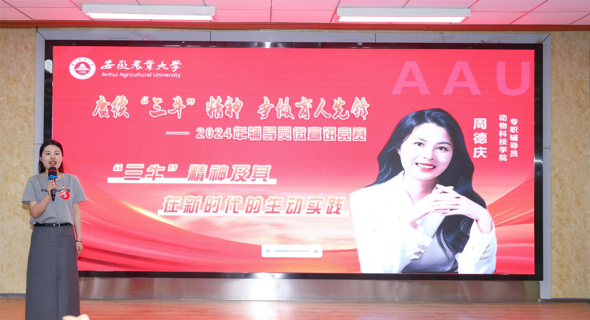比赛现场精彩纷呈,22位辅导员“擂台比武”亮实力,深入宣讲我校师生传承、弘扬和创新“三牛”精神的安农故事,内容丰富、主题突出、形式多样,展现了辅导员扎实的理论功底、丰富的实践经验和良好的精神面貌。经过激烈角逐,经济管理学院韩笑、动物科技学院周德庆最终获得一等奖;农学院李静、生命科学学院姚剑波、人文社会科学学院姚吴仪、经济管理学院田乐获得二等奖;园艺学院花荣越、林学与园林学院殷晓雨、工学院孙亮亮、园艺学院刘玉洁、园艺学院陆锐、材料与化学学院代锐获得三等奖;植物保护学院张小龙、信息与人工智能学院胡增增等10位老师获得优秀奖。