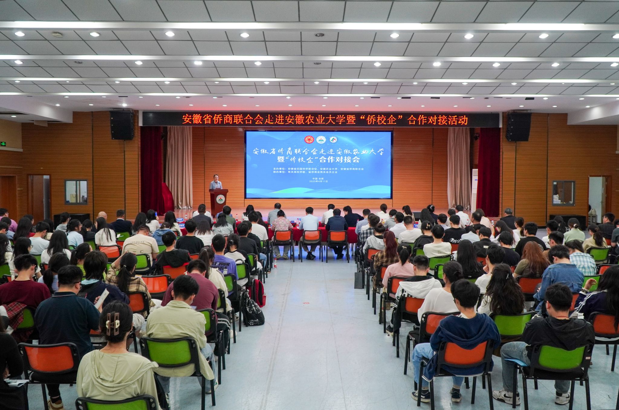 本网讯 4月11日下午,安徽省侨商联合会走进安徽农业大学暨“侨校企”合作对接活动在我校欣苑四楼大学生活动中心举办。省侨联党组书记、主席王汪苗带队参加活动。校党委常委、副校长李红,省侨联海外联络部(经济科技部)部长、省侨商会副会长兼秘书长宋德琴,省人社厅就业处处长唐晓峰,马鞍山市侨联党组书记、主席余卫红,省侨商会会长朱华及省内部分高校侨联、省侨商会侨企单位负责人出席活动。