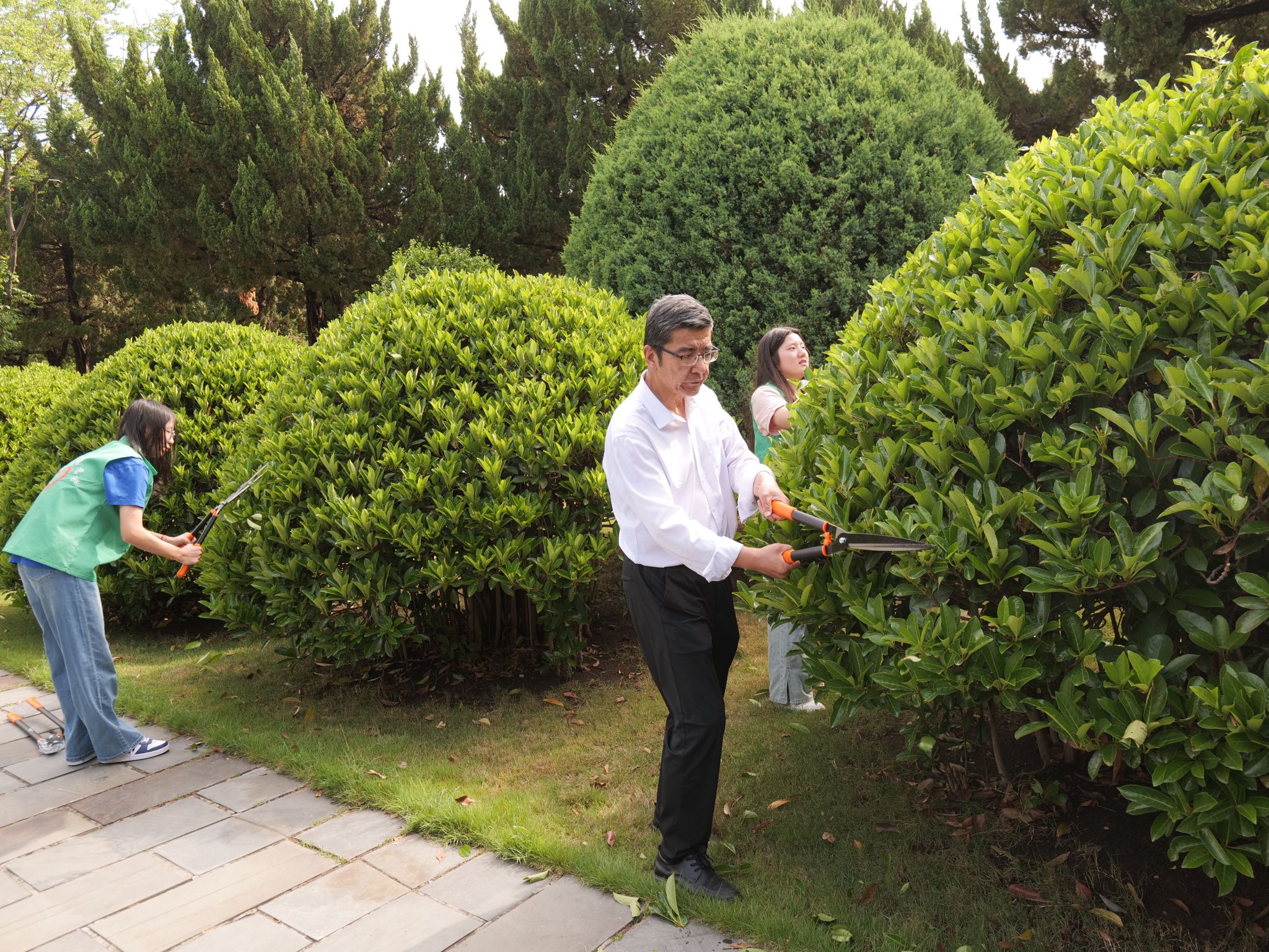 5月9日,校党委副书记董雨带领青马班学员、学生骨干等60余名师生参与“青春修绿志 劳动践初心”绿篱修剪活动。师生以绿篱为“画布”、工具为“画笔”在躬身实践中将园林美学理论与劳动技能深度融合,用一剪一修诠释“劳动即创造”的理念。