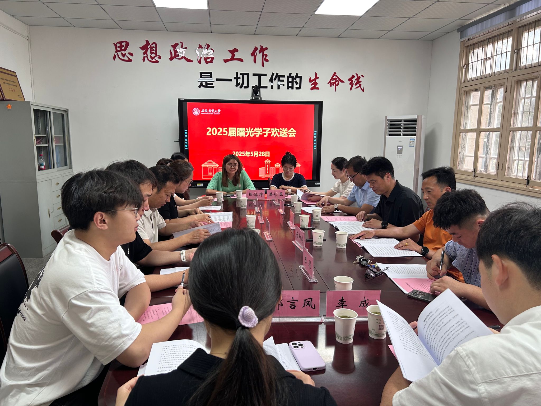 本网讯 5月28日下午,2025届曙光学子毕业生欢送会在勤政楼232会议室举行。校学生处副处长、学生资助管理中心主任吕大鹏,经济管理学院党委副书记周涛,百胜餐饮安徽公司公共事务部经理许勇,副经理宁向尚,历届曙光学子代表齐聚一堂,共同见证这一传承十六载的爱心项目圆满收官,为最后一届“曙光学子”送上殷切祝福。