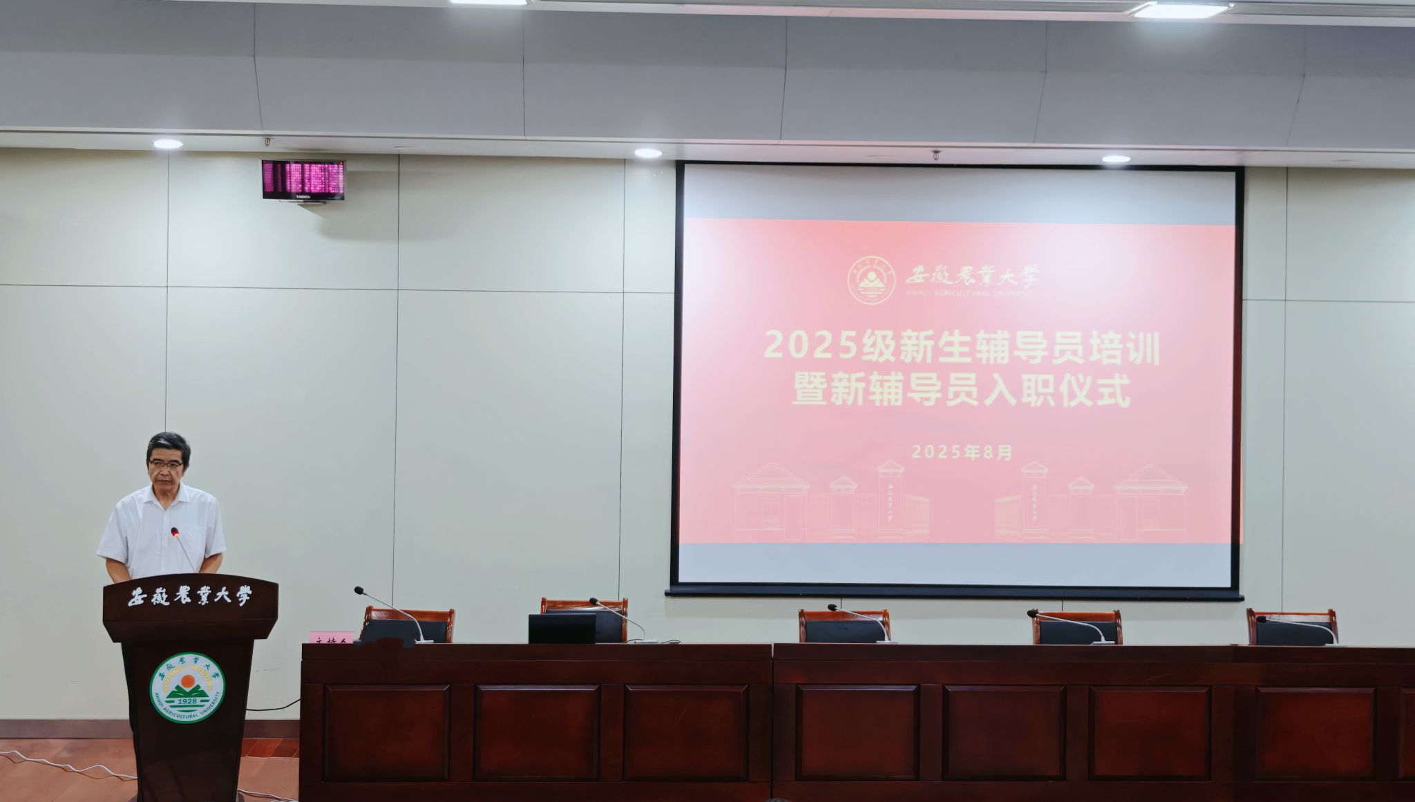 董雨带领参会各机关部门负责人为新入职辅导员赠送学习辅导包、佩戴校徽。安徽省最美辅导员、农学院专职辅导员彭琼琼带领全体新入职辅导员进行了庄严的入职宣誓。新入职辅导员胡玥、饶静作为代表发言,分享了对辅导员职业的理解与期待,表示将以饱满的热情、务实的作风投入工作,为学校育人事业贡献力量。