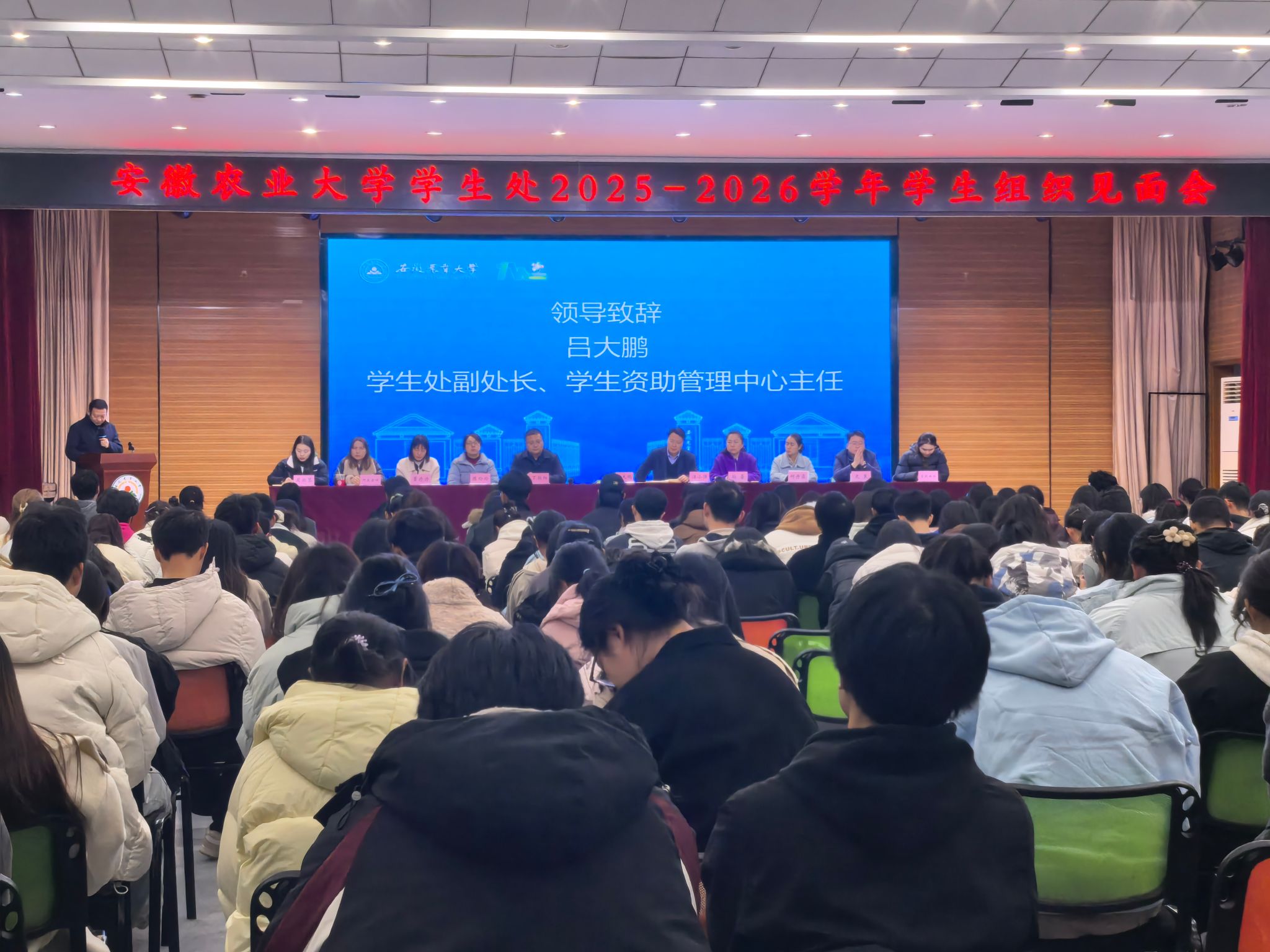 吕大鹏代表学生处对新一届学生组织成员表示热烈欢迎,充分肯定了各学生组织在过去一年的工作成效,并对未来学生组织的发展与服务提出了殷切期望。他指出,学生组织不仅是学校落实立德树人根本任务的重要阵地,更是大学生成长成才的广阔舞台。选择加入学生组织,意味着肩负起一份沉甸甸的责任与担当。他强调,各学生组织成员要铭记“身份之重”,成为知行合一的模范践行者。学业是大学生活的基石,大家要妥善处理好学习与工作的关系,以优异的成绩和良好的道德修养为工作增添底气、提升号召力。要胸怀“服务之本”,做同学身边的贴心守护者。将全心全意为同学服务作为组织工作的出发点和落脚点,主动倾听同学心声,密切关注同学们的“急难愁盼”,努力将服务工作落到实处、做到暖心处。要练就“实干之才”,成为善思能行的行动先锋。善于思考,精心做好活动的策划与复盘工作,将一个个金点子转化为实实在在的成果;勇于创新,积极打造具有影响力的品牌活动,敢于突破传统思维的束缚;善于协作,充分发挥团队的力量,加强部门之间的沟通与协作,形成强大的工作合力;勤于总结,认真做好复盘工作,在总结经验教训中不断提高效率。要恪守“作风之严”,做焕发青春活力的自律楷模。始终保持良好的作风,带头遵守校纪校规,以自身的实际行动为同学们树立榜样。(图/龚永乐、陈昊、王熙鑫、李博宇、陈夏仪 文/周雨琴 预审/汪小强 终审/吕大鹏)