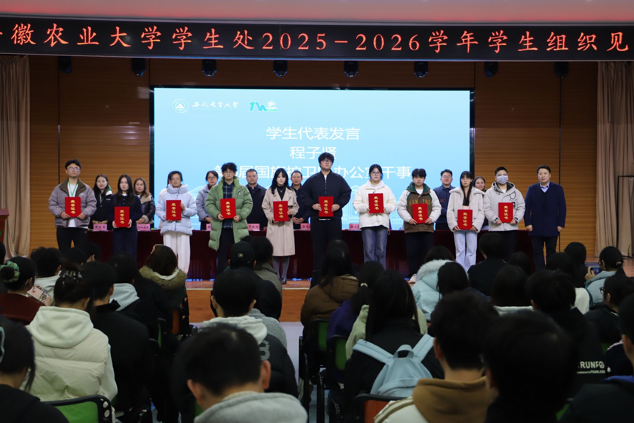 会上,汪小强为上一任学生组织优秀学生干部代表颁发荣誉证书。
