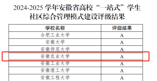 近日,省委教育工委公布2024-2025学年安徽省高校“一站式”学生社区综合管理模式建设评级结果,我校继2023-2024学年获评A级后,再度获评A级。