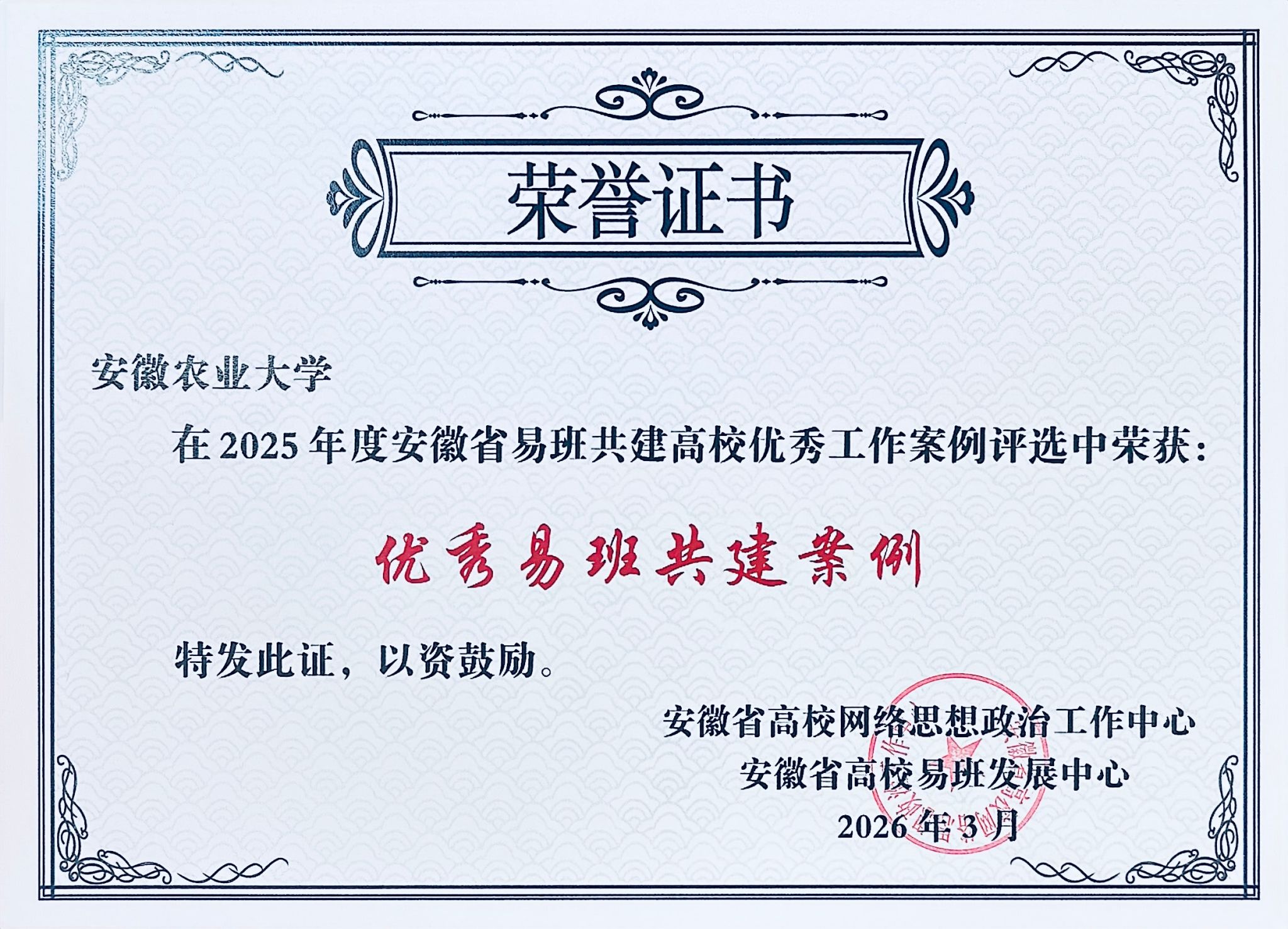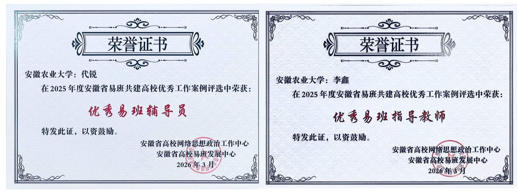 本网讯 近日,在安徽省高校网络思想政治工作中心、安徽省高校易班发展中心组织开展的2025年度易班共建优秀工作评选中,我校申报的《数字化赋能涉农高校发展型资助育人“四塑”实践》获评“优秀易班共建案例”,易班发展中心指导教师李鑫荣获“优秀易班指导教师”,材料与化学学院专职辅导员代锐荣获“优秀易班辅导员”。