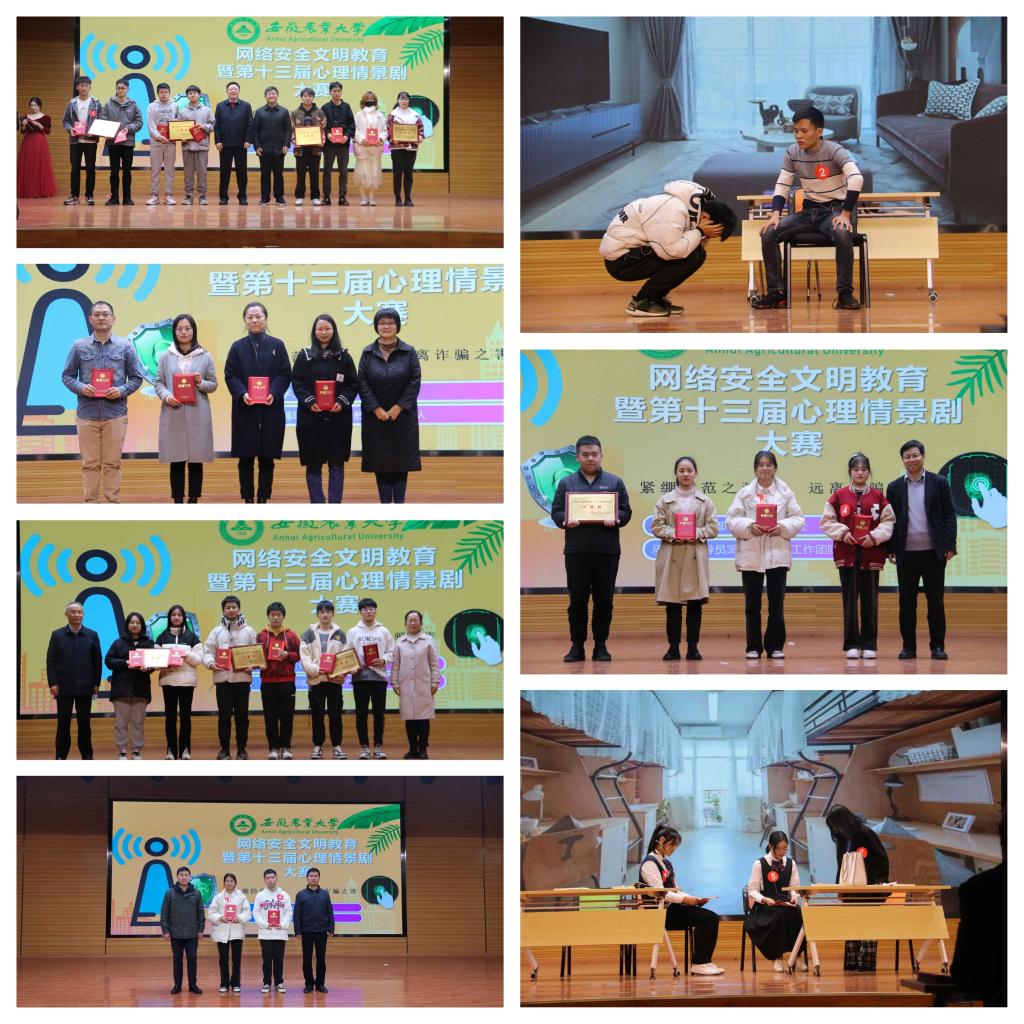 本网讯 11月30日晚,安徽农业大学校园安全文明教育暨第十三届心理情景剧大赛决赛在欣苑学生活动中心以线上线下相结合方式拉开帷幕。校党委副书记裴树东出席大赛并为获奖选手颁奖。大赛邀请合肥市公安局蜀山分局琥珀所所长卫修全、合肥工业大学李艳老师、学校党政办公室、教务处、宣传部、保卫处、团委等单位负责人担任评委,学工部(处)领导班子和相关学院学生工作分管领导、辅导员365安全教育团队成员、各学院心理联络员老师及学生代表在现场参加活动。