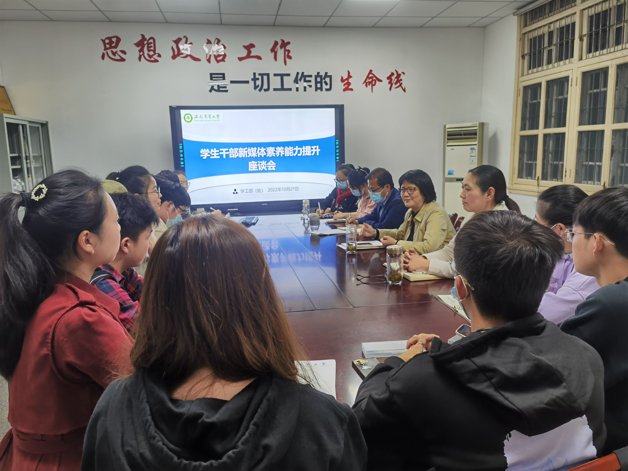 本网讯:10月21日下午,学工部(处)在勤政楼二楼会议室召开了学生干部新媒体素养能力提升座谈会,学工部(处)领导与所属四家校级学生组织新媒体团队成员面对面交流。