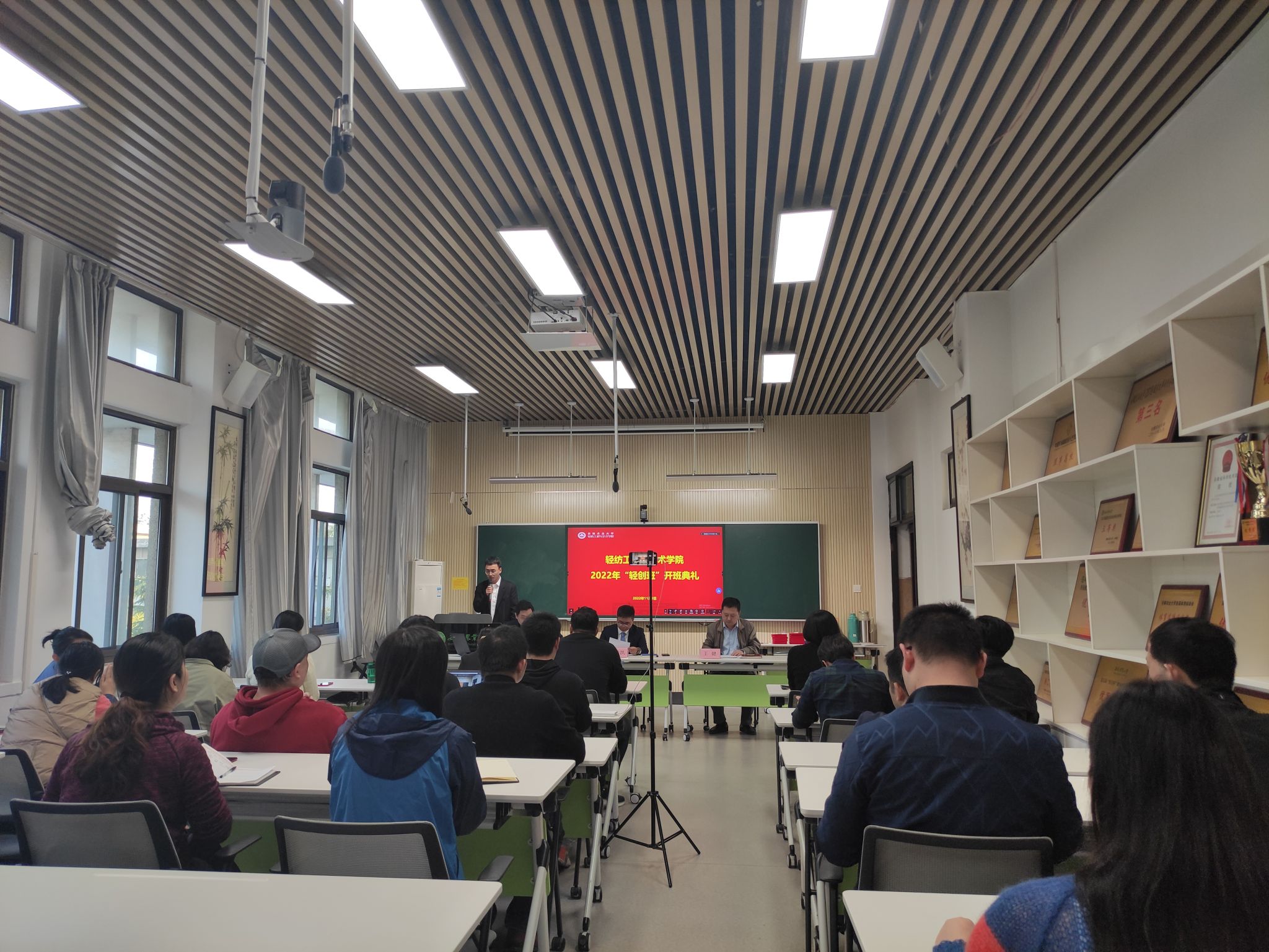 本网讯 11月9日下午,轻纺工程与艺术学院首届“轻创班”开班典礼在轻纺艺术楼402室举行,院党委副书记、副院长汪钟凯,党委副书记、纪委书记、副院长宋超,副院长王健,以及院党委委员、新生辅导员、“轻创班”指导老师和“轻创班”学生代表参加本次开班典礼,本次开班典礼由新生辅导员代锐主持,并采取线上直播形式。