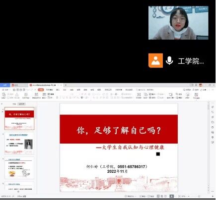 本讯网 11月14日晚,工学院以线上和线下结合方式组织开展了“大学生自我认知与心理健康”为主题心理健康讲座,讲座由国家二级心理咨询师何仁婷老师主讲,学院22级全体新生参加。