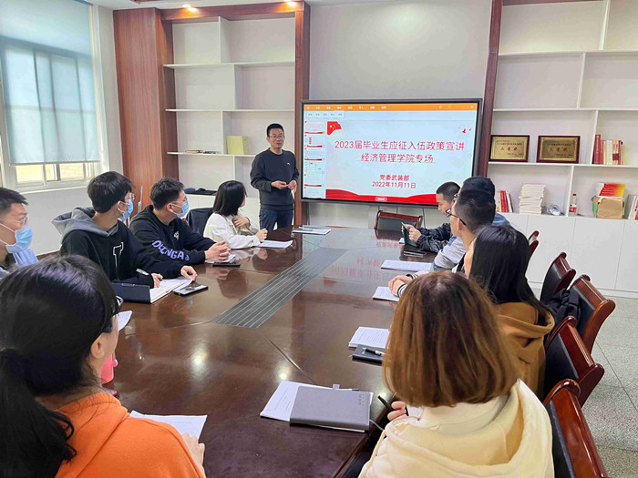 本网讯 11月11日上午,经济管理学院2023年春季征兵动员大会在302会议室顺利召开。学院邀请校党委学工部(处)国防教育科科长程玉磊老师进行征兵政策宣讲,2019级毕业生辅导员和学生代表参加了此次会议。