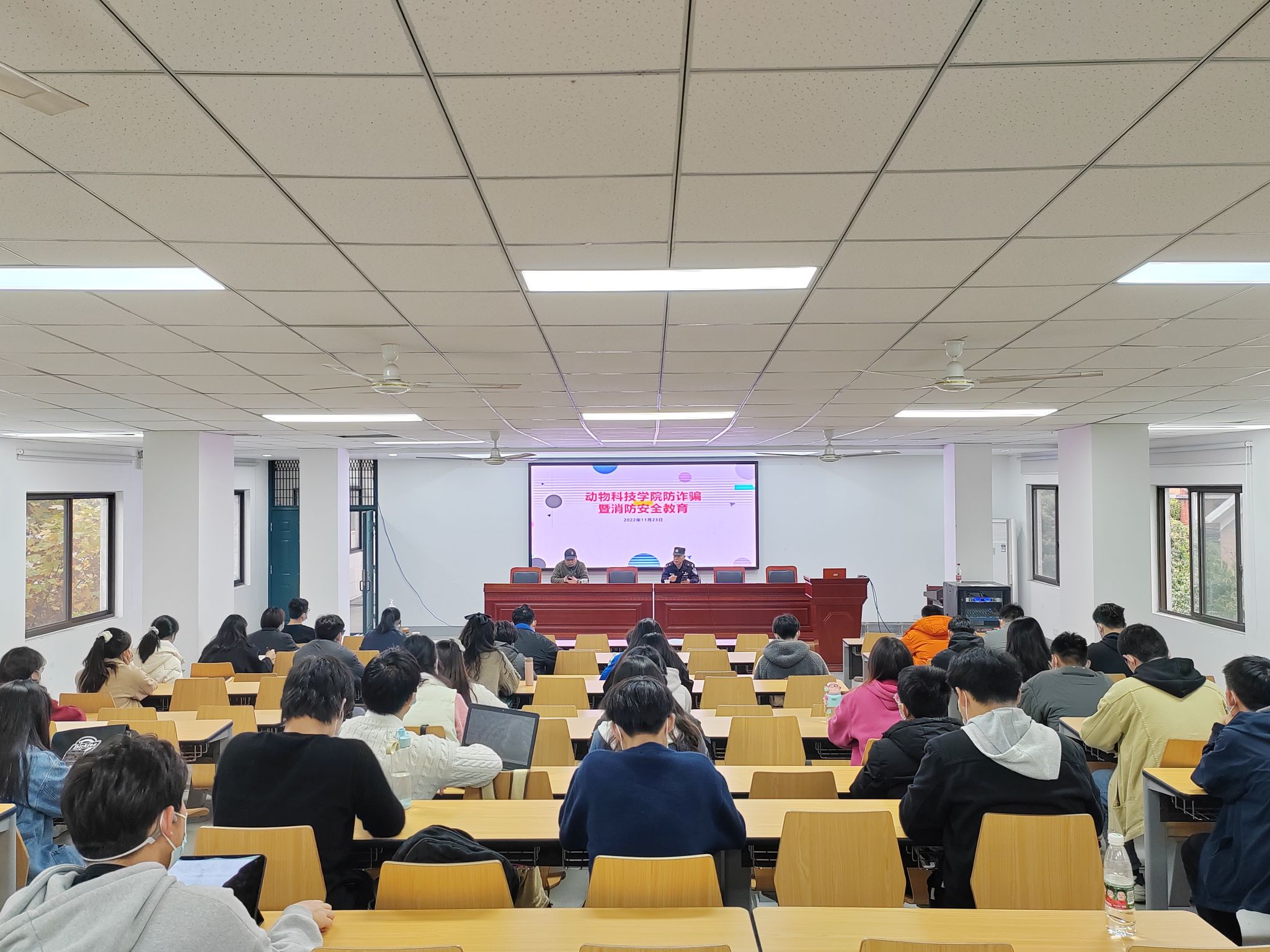 本网讯 11月23日下午,动物科技学院在动科楼318阶梯教室举行防诈骗暨消防安全教育知识培训会。蜀山区琥珀派出所三级警长孙健民,学院党委书记曹俊出席会议。学院全体专兼职辅导员及各班级安全委员参加会议。