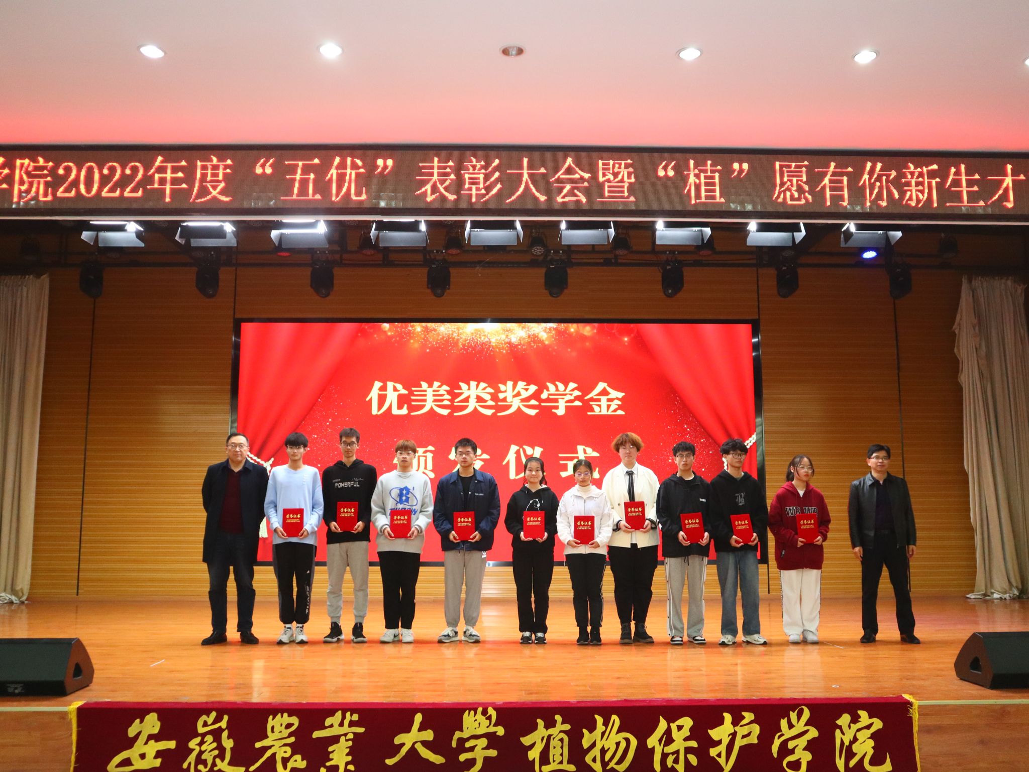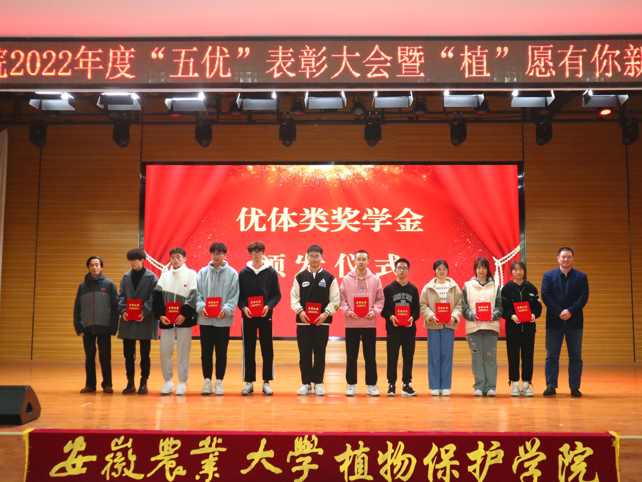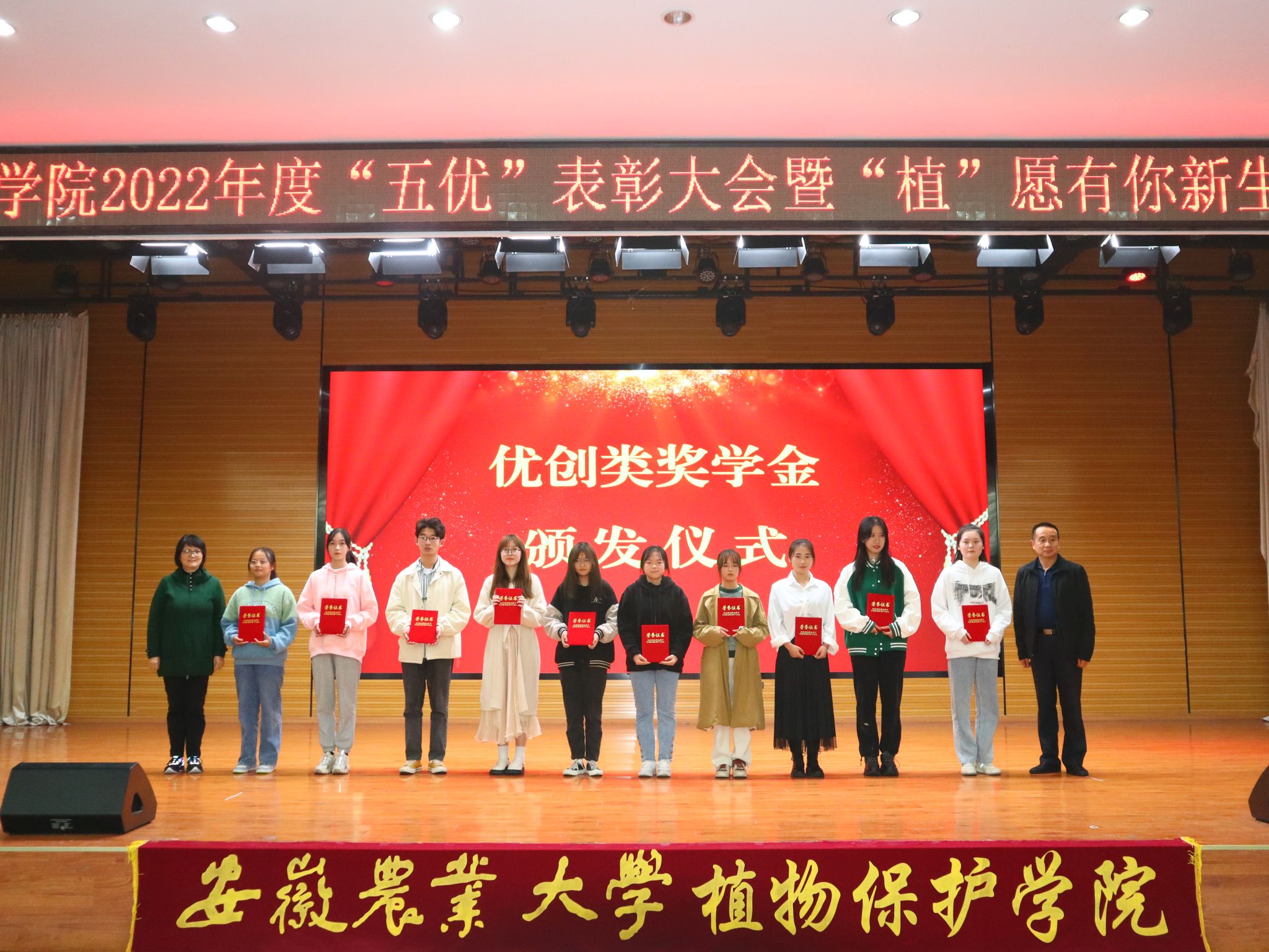 校党委常委、组织部部长韩平,教务处处长曹成茂,学工部部长姚莉,招就处处长刘海涛,后勤保障处副处长江海波,校团委副书记武晓蓓,体育部副主任尹维增,全国模范教师李桂亭,省劳模高智谋,追梦安农人余林生等分别为优学、优创、优体、优美、优劳等五个类别奖学金获奖同学颁奖。学院党政领导班子、学院获得2021年度校级“最美教师”“最美辅导员”“最美教育管理工作者”的教师以及2021年度获得“优中优”奖学金同学分别宣读获奖同学名单。与会同学纷纷表示将向榜样学习、向优秀看齐,争做怀抱梦想又脚踏实地、敢想敢为又善作善成的新时代植保好青年。