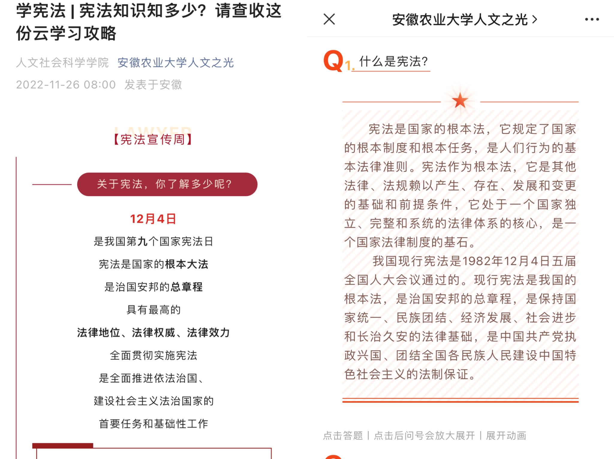 开展线上普法,弘扬宪法精神。学院依托微信公众号将《宪法》重要内容、宪法与生活等知识及时推送,营造浓厚的学法氛围,共同打造学法懂法用法的和谐校园。(作者:刘云,一审:吴永红,二审:黄洪雷)