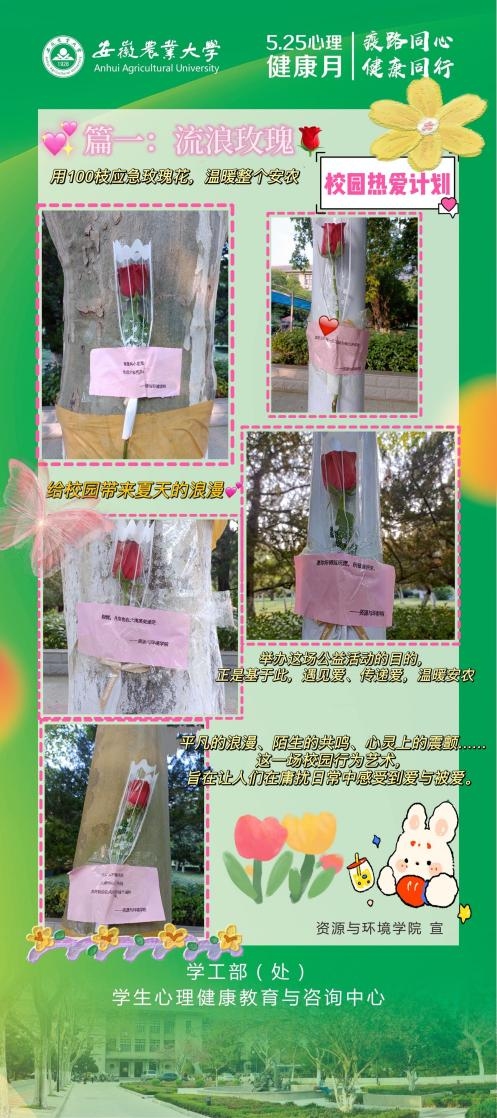 本网讯 5月中上旬,资源与环境学院举办了“525·我爱我”心理健康主题活动,本次活动主要由“流浪玫瑰”和“植物画”两部分组成。