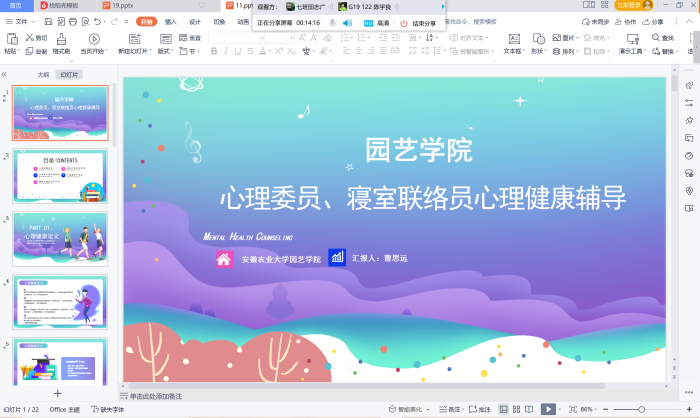 培训中,解释了什么是心理健康,并对大学生心理健康问题的现状进行了深层次的剖析,探讨了在大学生活中乃至人生中遇到压力时,如何舒缓心情。在会议的最后,对同学们在校生活提出了几点建议。