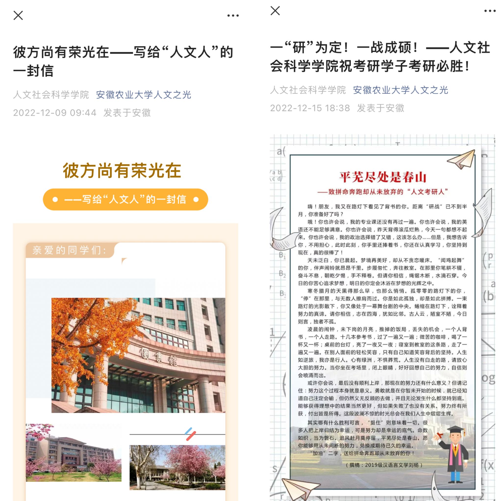 为帮助在紧张备考阶段的考研学子疏导心理压力,坚定目标,自信面对考试。人文学子自发创作《彼方尚有荣光在——写给“人文人”的一封信》《平芜尽处是春山——致拼命奔跑却从未放弃的“人文考研人”》,用温暖的语言安抚心灵,以文字的力量激励人心,字里行间写满了学院师生对考研学子的关心与呵护。