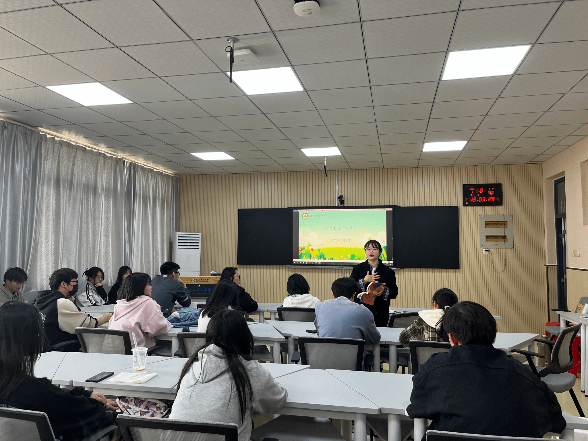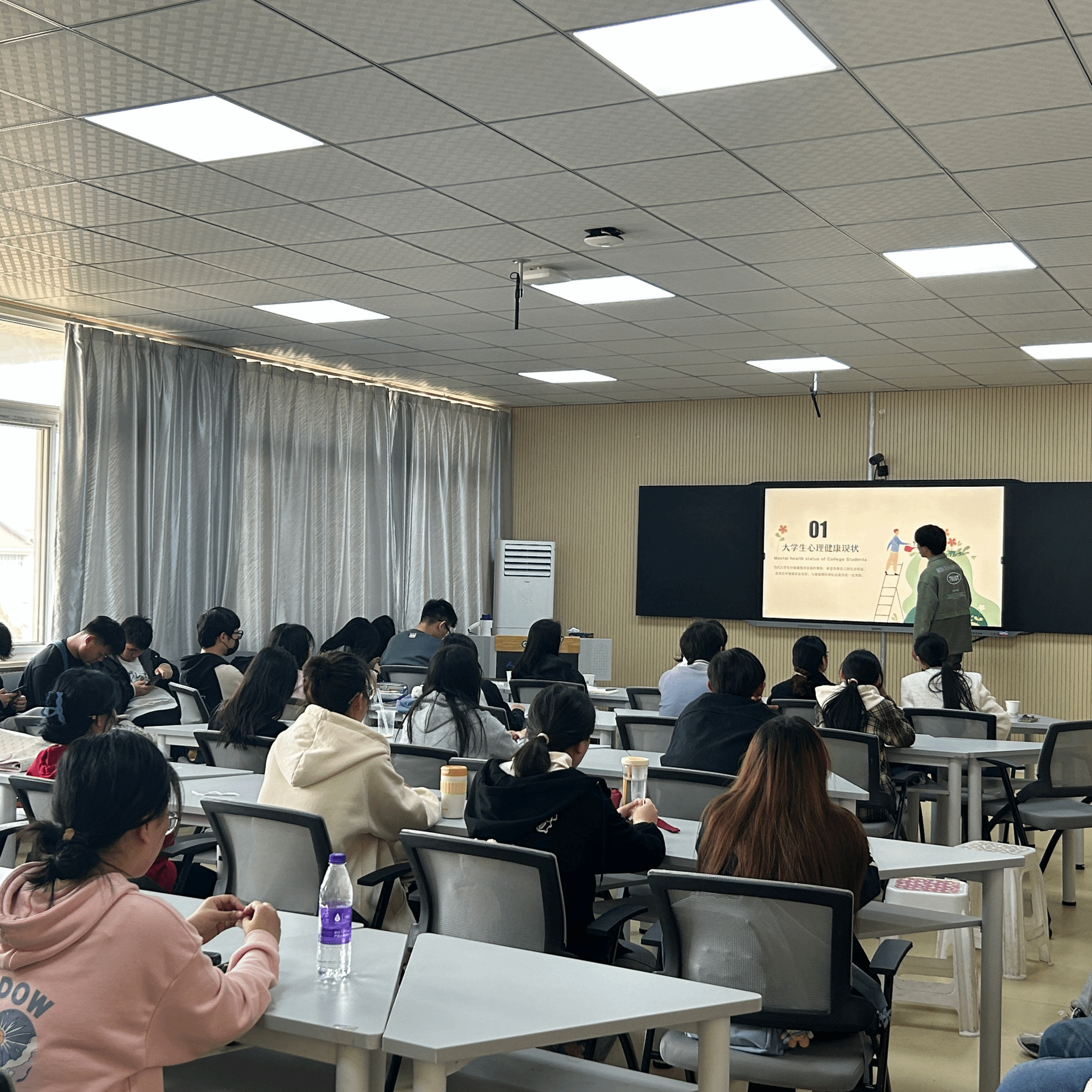 心理委员通过《健康,从心开始》《和拖延症Say Bye》《朋辈互助友爱校园》主题班会讲解心理学知识,化解心理困惑,排解心理压力,为同学在大学阶段更好地学习、生活,处理好同学之间的人际交往提供帮助。