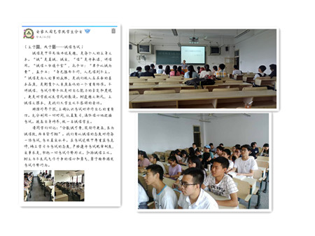5月-6月,学院利用线上线下相结合,分散与集中相结合的方式,积极宣传诚信知识,大力弘扬诚信美德,学院集中、班级分散开展诚信金融知识讲座。讲座由学院学生分会公益部学生干部结合真实案例,自主选择相关题材进行讲授,对诚实守信进行深入宣传,通过这种自我教育,自我引导,自我反省的方式进一步增强了学生的感恩意识、法律意识,培养了学生的诚信观念和勇担责任的品质。