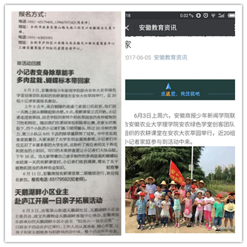 本网讯 为了向城市家长和孩子传播农耕文化,辨识多彩的植物和昆虫,理学院安农绿色学堂创业团队联合安徽商报少年新闻学院于6月3日和6月11日举办两期“识多彩植物,做绚丽标本”农耕课堂,共有40组家庭,80余人参与。丰富多彩的活动形式得到了家长和孩子们的一致好评,也得到了安徽教育资讯和《安徽商报》的充分宣传和报道,反响热烈。