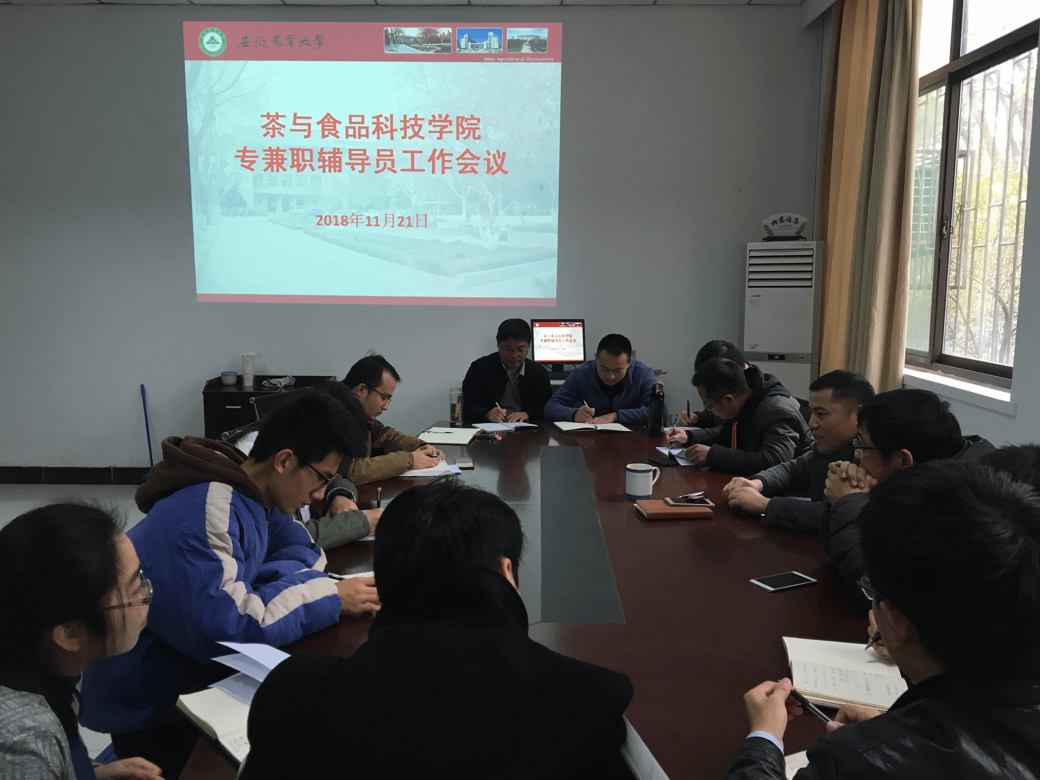 本网讯 11月21日下午,茶与食品科技学院在茶业楼106会议室召开专兼职辅导员专题学习会,重点学习习近平总书记在全国教育大会上的重要讲话精神。全体专兼职辅导员参加了会议,会议由学院党委副书记、副院长张国学主持。