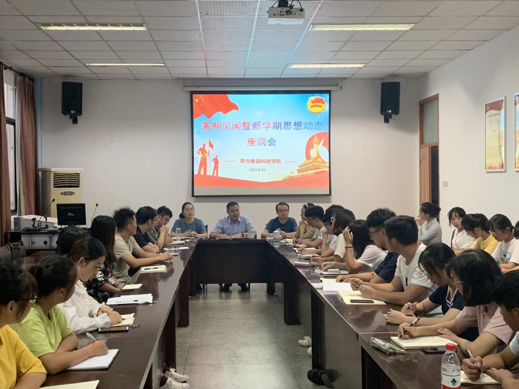 本网讯 8月30日,茶与食品科技学院在茶业楼105室召开暑期见闻暨新学期思想动态座谈会。学院党委副书记、纪委书记、副院长张国学、学院办公室老师、参加暑期社会实践的同学、团干部以及学生会部分学生代表参加了座谈会,会议由学院团委老师主持。