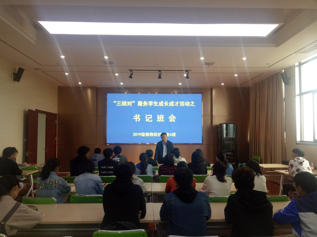 本网讯 近日,植物保护学院党委书记檀根甲和党委副书记、纪委书记、副院长戴照力,分别组织召开结对班级的主题班会,与2019级新生面对面交流。一名院领导结对一个新生班级,是学院“三结对”服务学生成长成才活动的内容之一。
