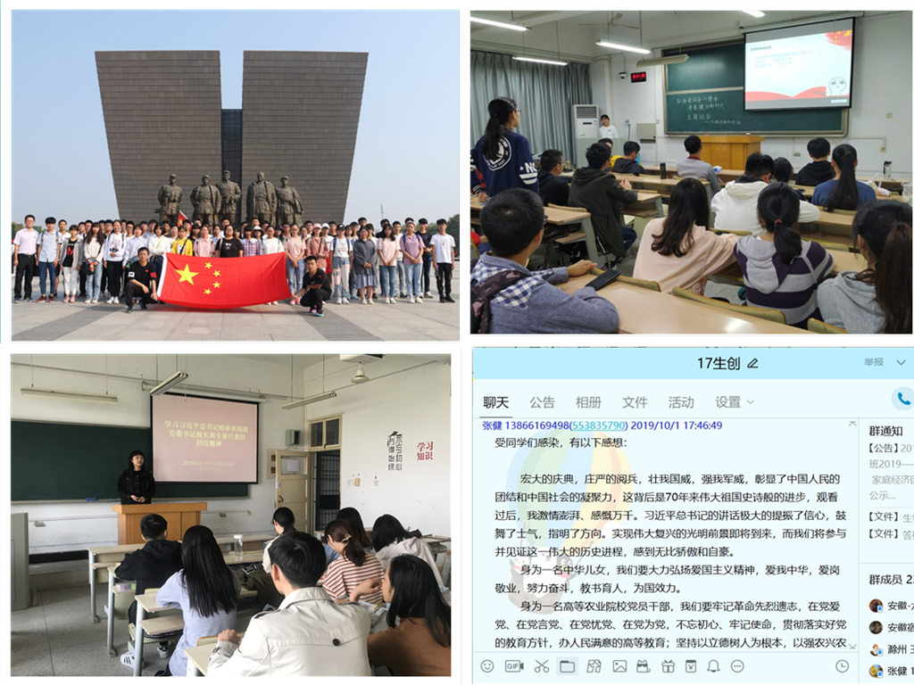 各班级通过PPT展示、主题演讲、演唱红色歌曲、参观爱国主义教育基地等形式,抒发对伟大祖国的热爱和赞美之情。2016、2017级生物类创新实验班以“主题讨论”的形式学习习近平总书记给全国涉农高校书记校长和专家代表的回信精神;2017级生物科学专业以“观影有感”的形式抒发爱国情怀;2018级应用生物科学专业以“我与团旗合张影,我为祖国唱首歌”的形式歌唱伟大祖国;2018级生物技术专业以“国情国史知识竞赛”的形式回顾建国历史,激发民族自豪感;2019级生物制药专业以“弘扬爱国主义,培育新青年”主题演讲的形式展示新青年的爱国热情;2019级应用生物科学专业以“参观渡江战役纪念馆”的形式聆听革命前辈英勇事迹,更加坚定青春建功新时代的信念。