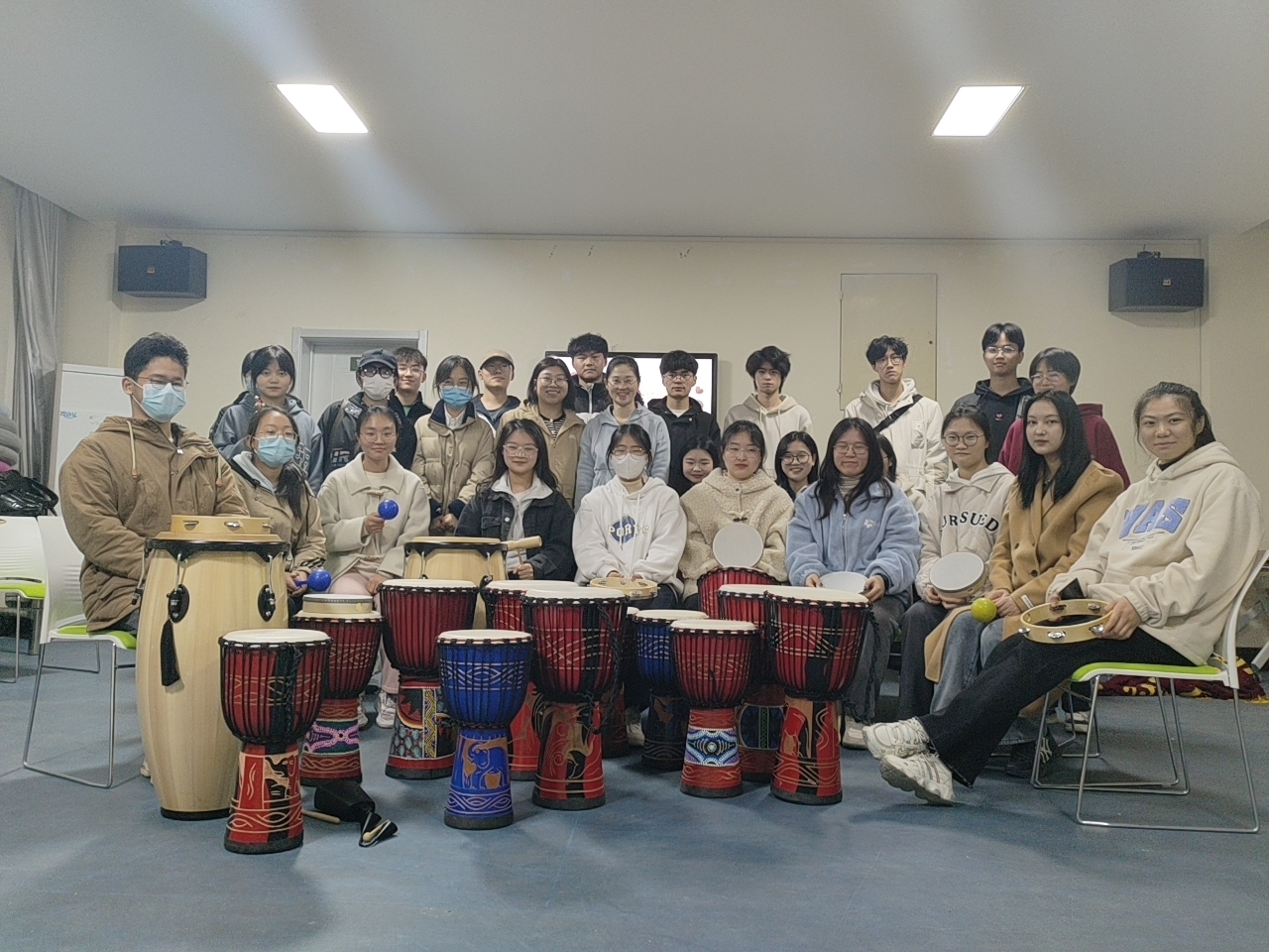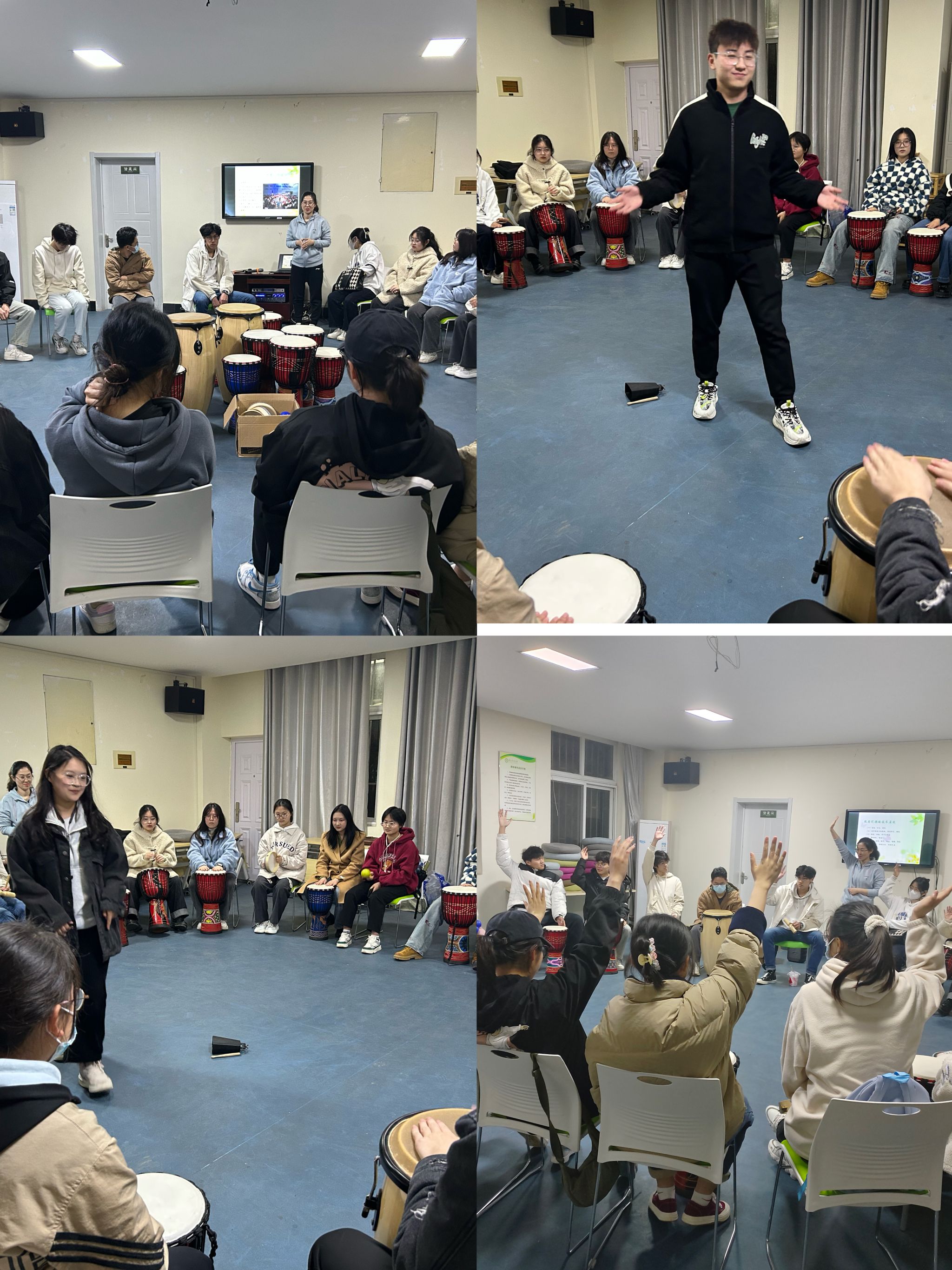 活动在“相互击掌”的开圈游戏中拉开序幕,热场游戏拉近了同学之间的距离,打破了成员之间的生疏感。参与者不需要有音乐基础和学习乐器的经验,用手里的乐器自由表达。在赵爽引导师的引导下,同学们逐渐放松,沉浸式体验,感受到团队协作的快乐,激发自由和活力的生命力,勇于展现个性,合理表达情绪,体验合作的快乐,构建和谐稳定的团体。现场气氛热烈,鼓声此起彼伏。