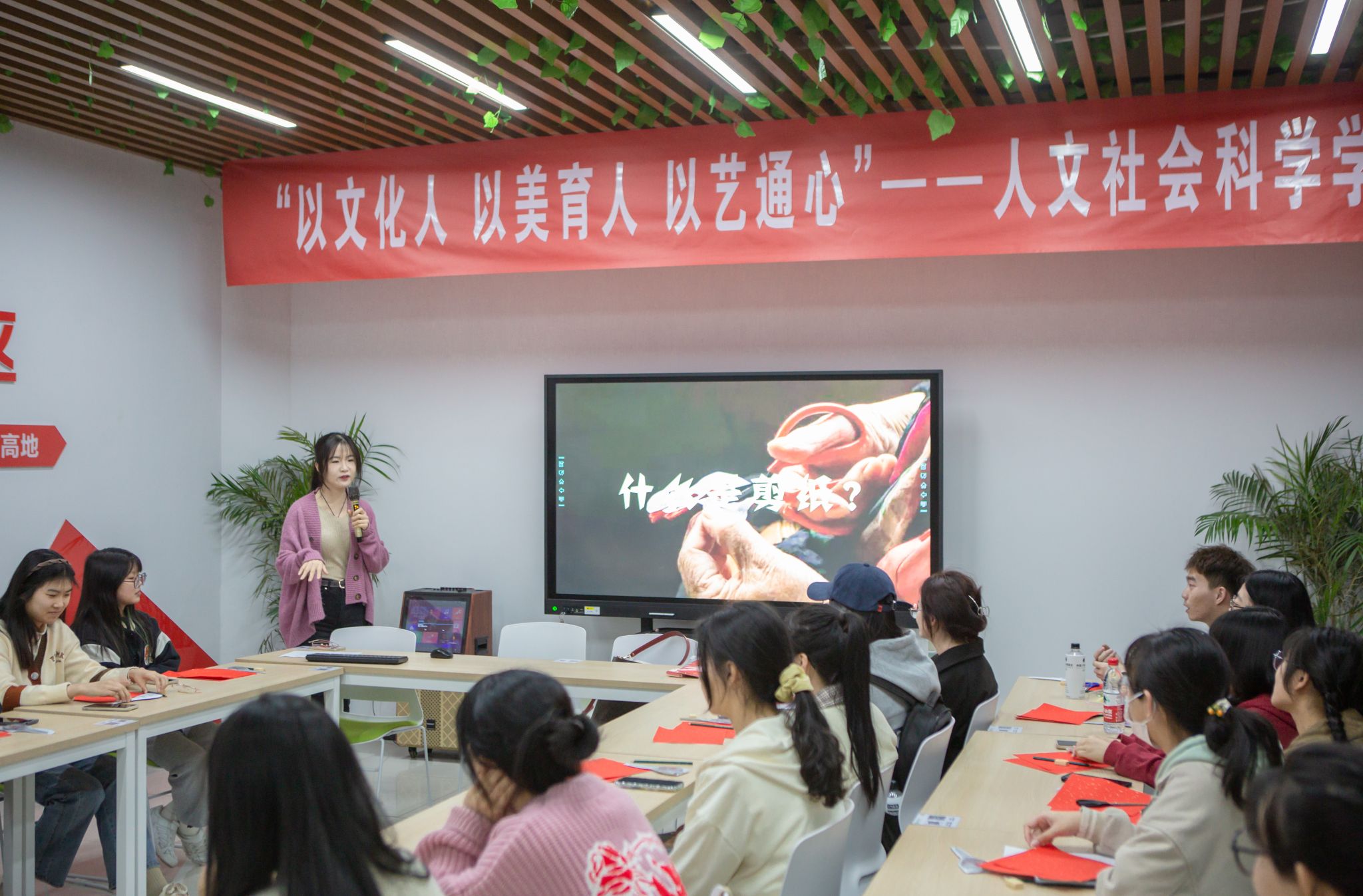 3月29日晚,人文社会科学学院在大学生公寓“一站式”学生社区服务中心开展“展剪纸韵 传民俗情”民俗文化体验活动。活动由学校艺术部教师张涵主持,学院专职辅导员及部分学生代表参加了此次活动。