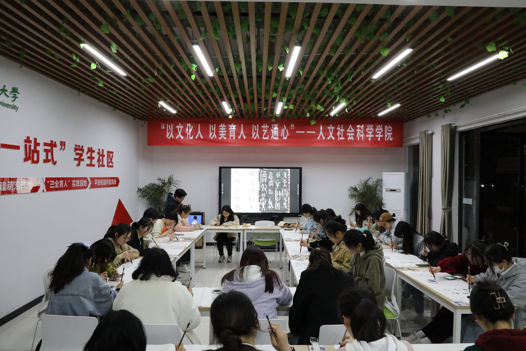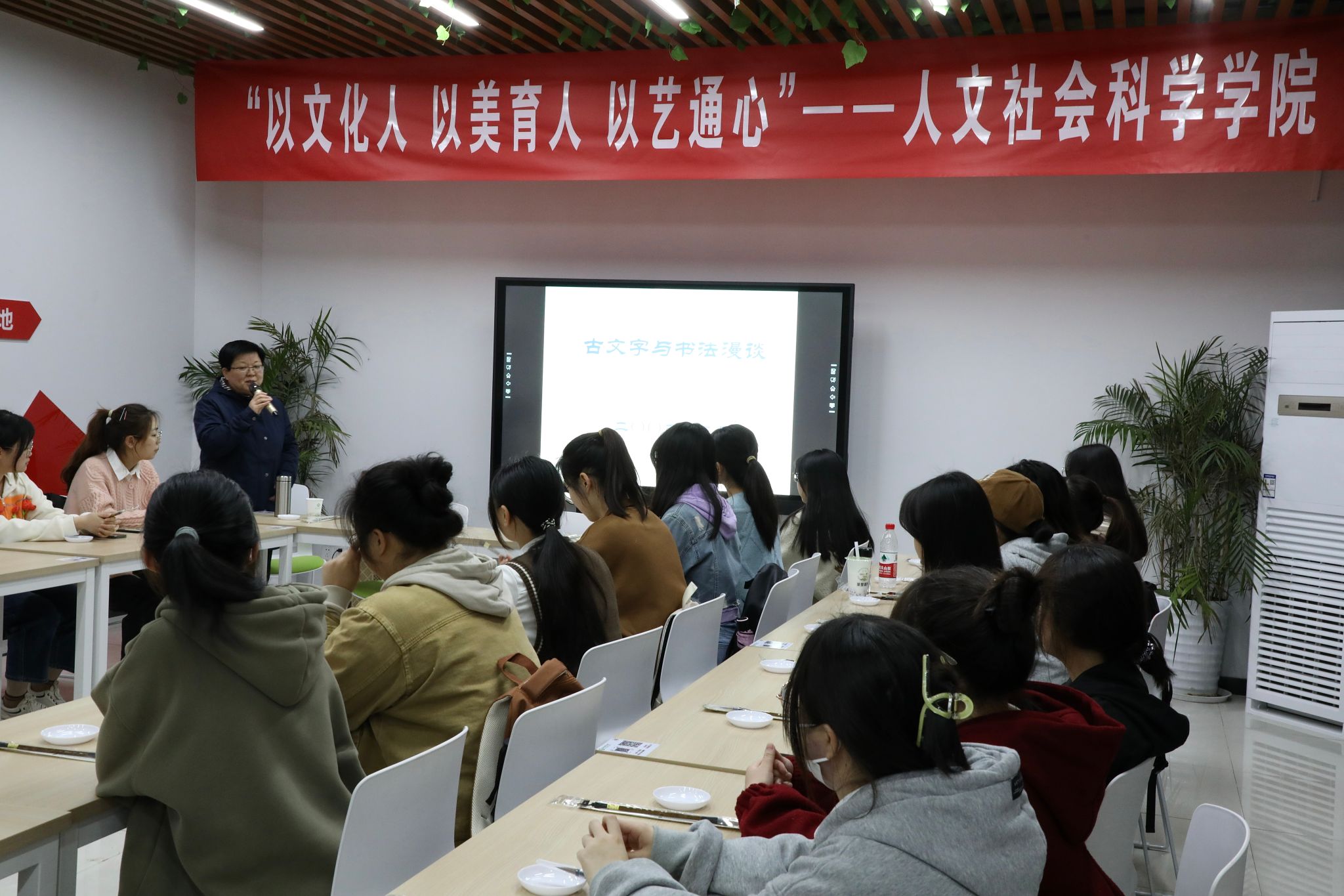 3月30日,人文社会科学学院在校“一站式”学生社区服务中心开展“品中国字 寻民族魂”古文字宣传活动,让更多学生了解古文字的独特魅力。活动由学院中文系教授吴红松主讲,学院专职辅导员及部分学生代表参加了此次活动。
