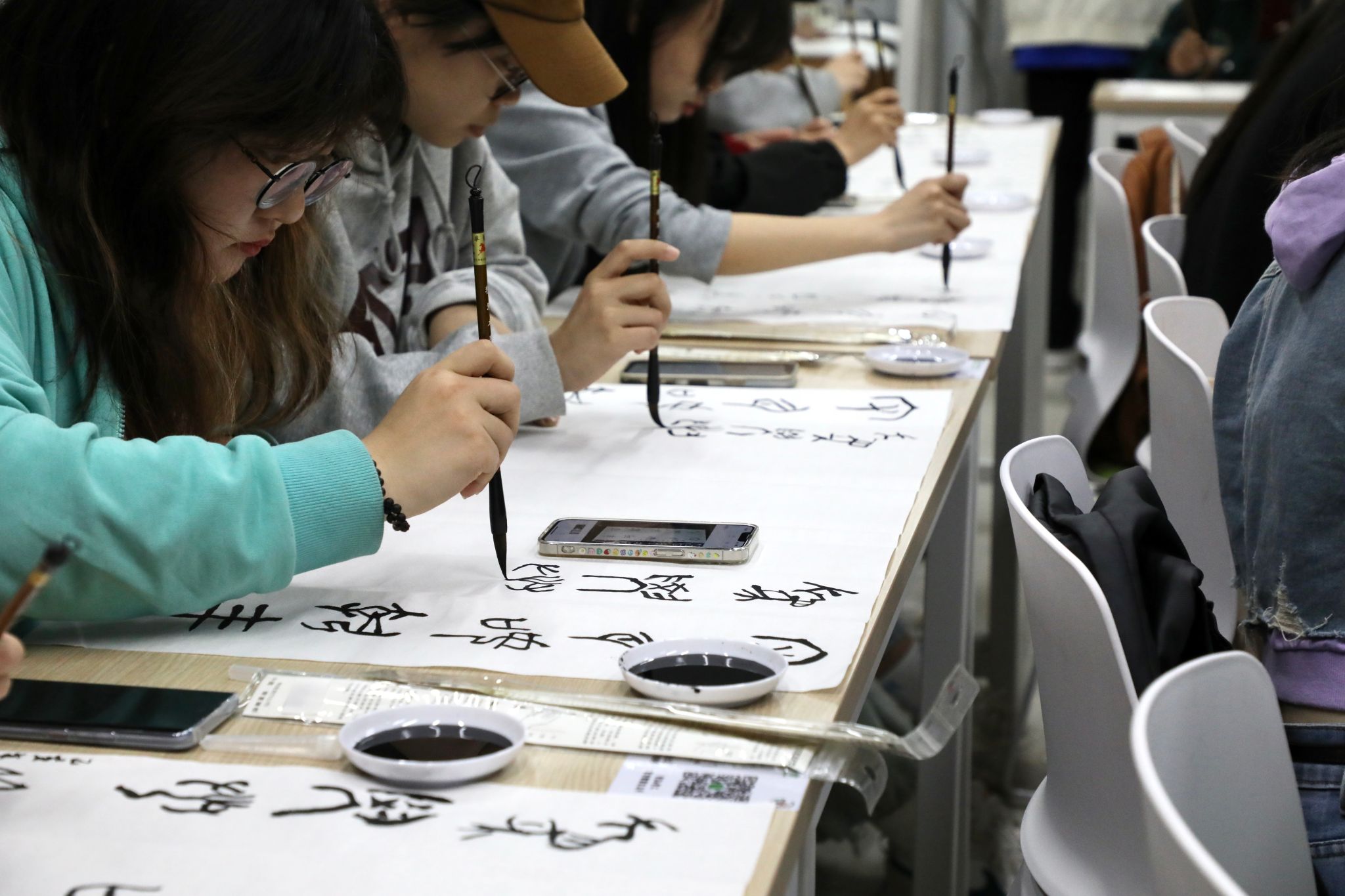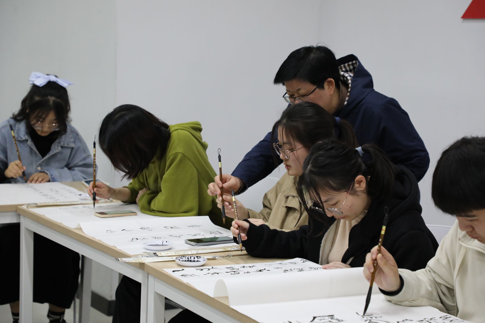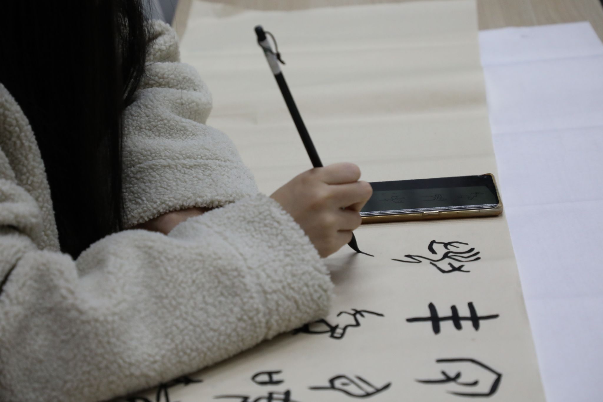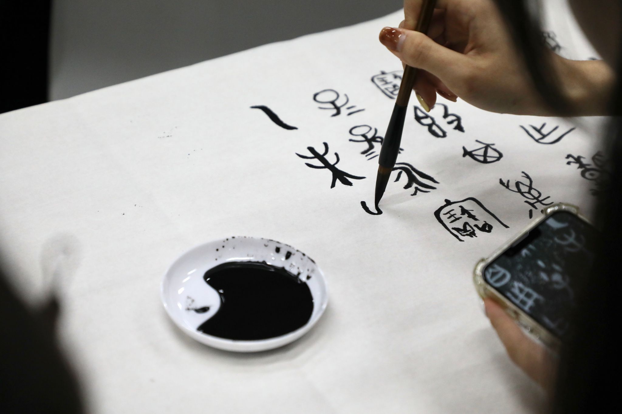 活动过程中,吴红松从古文字的起源、主要书写工具和载体、汉字形体演变过程等方面进行阐述,着重对中国历史上的古文字,如甲骨文、金文、战国文字等一一进行了详细的介绍,并与学生们分享了自己赴国外开展汉字教学与文化传承的经历。她表示古文字是中华文明的重要组成部分,传承着中华文明的基因血脉,我们要保护好、发扬好,让古文字绽放活力。活动现场,吴红松指导学生们用毛笔在宣纸上书写古文字,亲身感受中国古文字的独特风貌和艺术魅力。