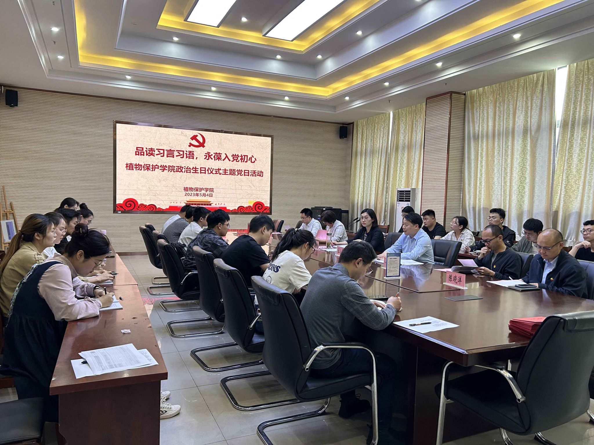 本网讯 为营造学习贯彻习近平新时代中国特色社会主义思想主题教育的浓郁氛围,践行习近平总书记对青年的殷切嘱托,加强党性教育筑牢思想之基,创新党员师生“六学”方式,5月4日上午,植物保护学院党委在中西部综合楼1213会议室,以品读“习言习语”、永葆入党初心为主题,开展政治生日仪式主题党日活动。学院党委书记刘柳、学校2022年度师德典型人物陈莉教授等5名党员教师和36名研究生、本科生党员参加会议。会议由院党委副书记、纪委书记、副院长汪小强主持。