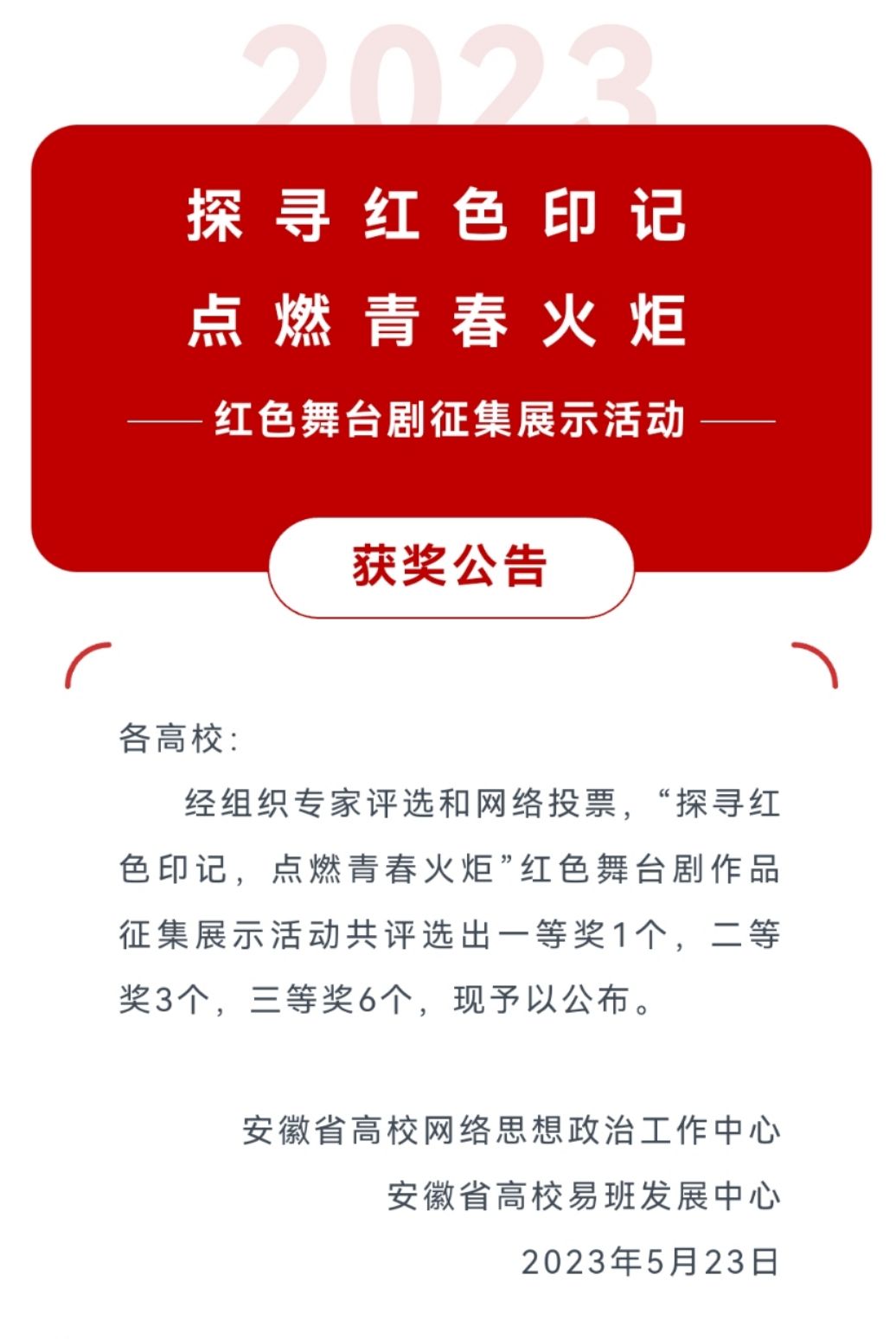 本网讯 4月4日至5月23日,安徽省高校思想政治网络工作中心与安徽省高校易班发展中心联合开展了“探寻红色印记,点燃青春火炬”红色舞台剧作品征集展示活动。经专家评选和网络投票,我校植物保护学院选送的作品《黎明将至》荣获二等奖。