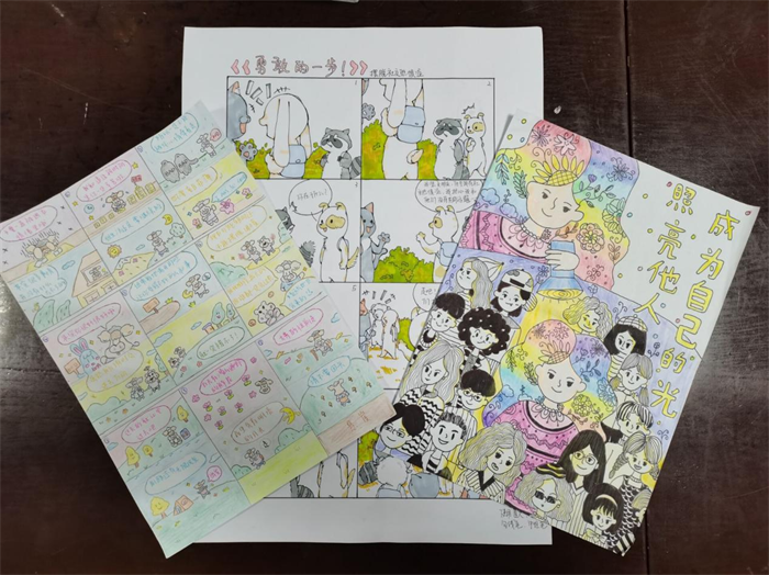 活动中,各位同学用明确的主旨与温馨的画风,向我们展现了各具特色的优秀作品,其中一张名为《勇敢的一步》的心理漫画,凭借其流畅的故事安排,美丽的绘画排版与清晰的主题,鼓励大家勇敢迈出与人交流的第一步,给人勇气的鼓舞和生活的建议。