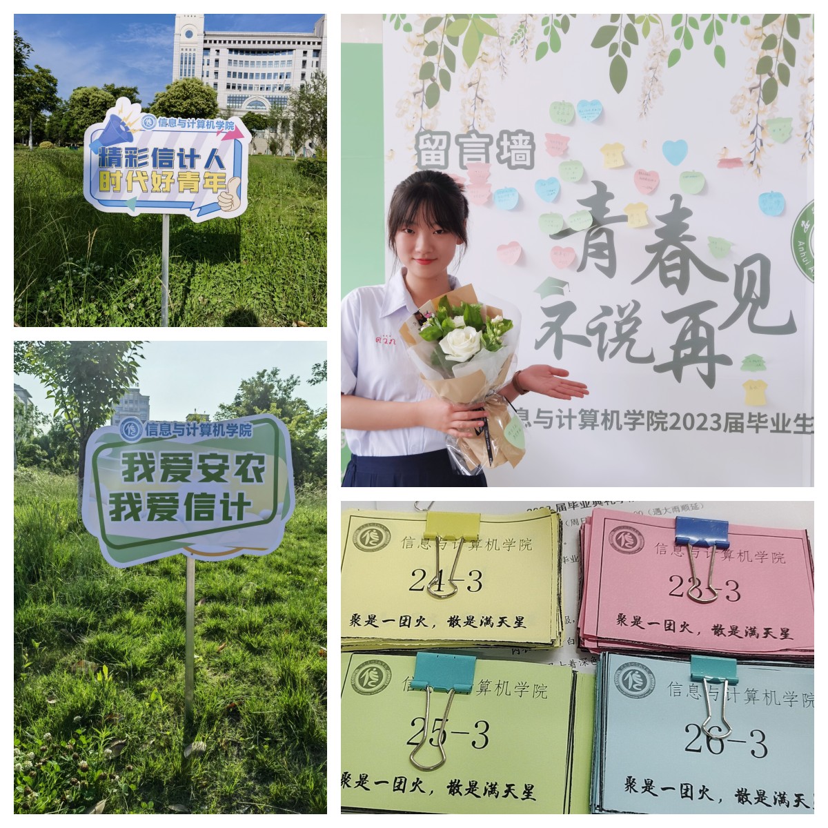 始于初秋,终于盛夏,山水万程,以物寄情,四季挂念。在美丽的安农校园里,每一个角落,每一栋建筑,都见证了毕业学子的成长和奋斗。在这特殊而珍贵的毕业季,学院特别精心设计了毕业墙、座位签、祝福牌等一系列的毕业纪念物,让同学们在离别的时刻,以物寄情,把对校园、对学院、对老师、对同学的浓浓思念和祝福都刻在心中。这些特别设计的毕业纪念物不仅以物寄情,更是一份特别的纪念,代表了信计学子与学校、与校友、与老师们深深的情谊和回忆,希望它们将成为毕业学子人生中重要的标记,伴随大家走向更广阔的天地。