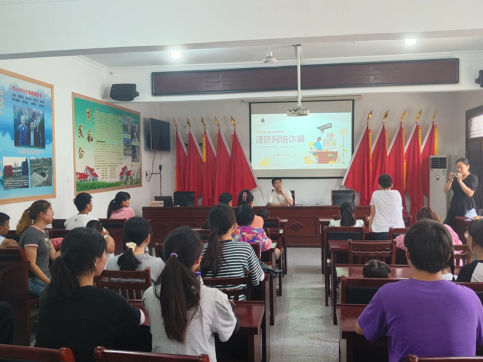 本网讯 为持续深化防范电信诈骗宣传教育预防工作,进一步提高居民的防范电信网络诈骗能力,营造推动乡村振兴和谐稳定的社会氛围,守护好百姓的“钱袋子”。7月11日,安徽农业大学信息与计算机学院赴巢湖市银屏镇人民政府综合文化站、岱山村等地开展暑期“三下乡”社会实践活动。团队成员化身“安全卫士”,根据不同群体,采用不同方式,开展了多层次防诈骗宣讲活动。