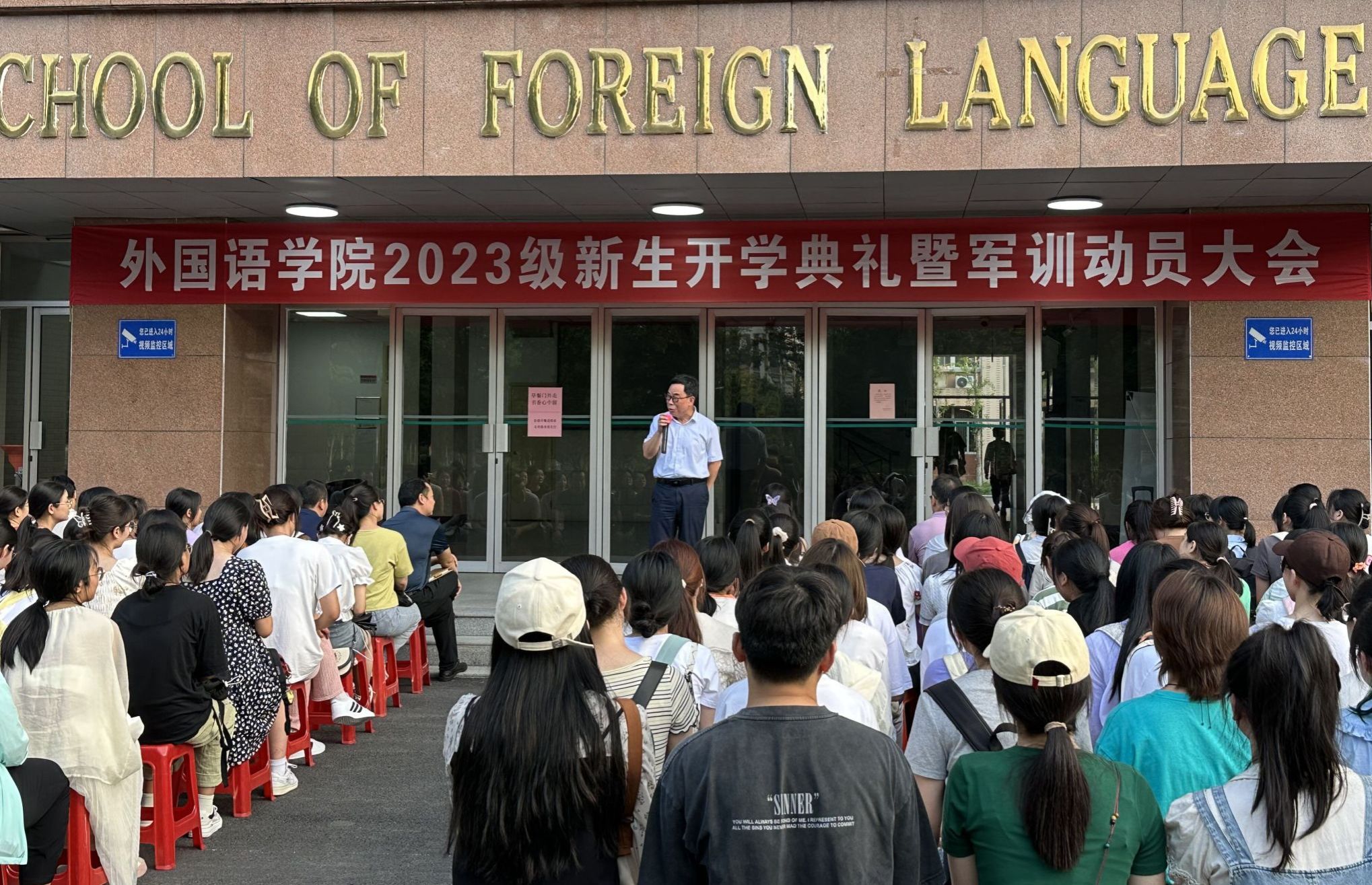 9月8日下午,在外语楼门前举办了2023级新生开学典礼暨军训动员大学,强调青年学生要立志,人无志不立,国无志不强,要志存高远,胸怀祖国和世界;要博学,把语言与社会发展、国家富强结合起来,博学多识;要珍惜,珍惜青春,大学四年漫长而又短暂,做好规划,珍惜健康,健康的身体是学习和生活的重要保障;要感恩,感恩家人、学校和社会的关心和支持。军训是大学教育的重要一环,意在锻炼体魄、磨练意志,激发吃苦耐劳的精神和爱国卫国的意志,要严格落实、积极参与,为四年的大学生活打下良好的基础。