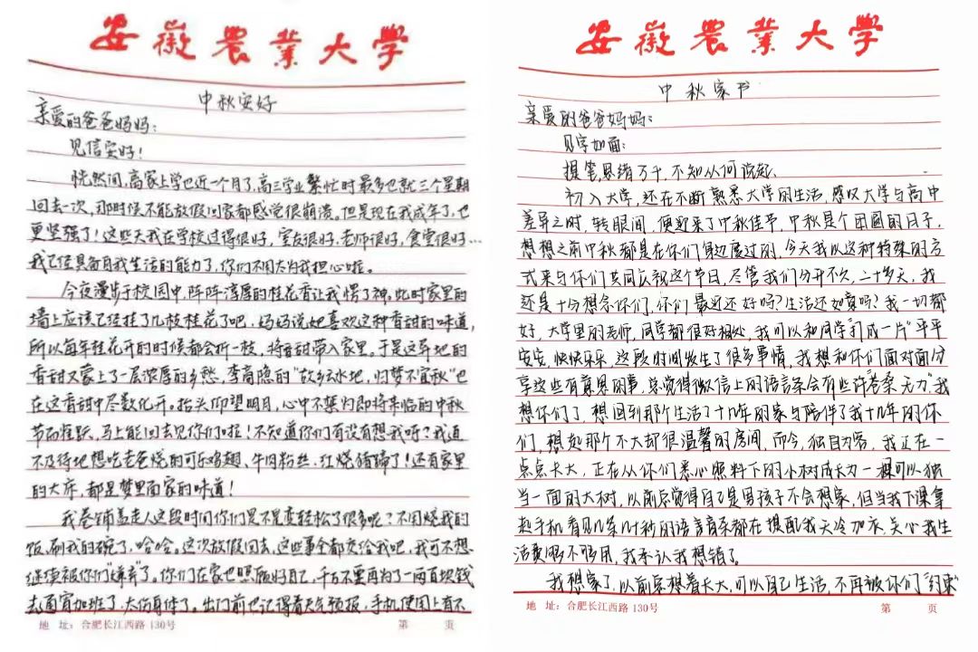 本网讯 “爸妈,我在学校一切都好,大学里的老师、同学都很好相处,与室友们也相处的十分融洽。” “亲爱的爸爸妈妈,大学生活丰富多彩,我会在这个过程中不断努力、前进,寻找我真正热爱并想要的东西。”“亲爱的爸妈,学校的食堂饭菜很好吃,超市种类丰富,校园环境很美,你们不要担心我喔”……
