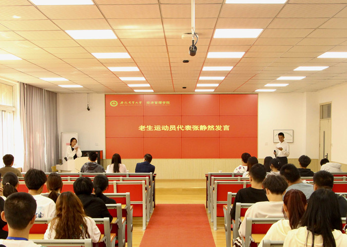 会上,经济管理学院团委老师首先对第57届田径运动会学院参赛情况进行了总结,从参赛态度、赛事训练、比赛策略三个方面分析了去年参赛过程中存在的问题和失误,并提出在今年参赛过程中要加以重视、全力规避。其次,学院团委老师从前期准备、体测情况、一轮至三轮训练安排、后勤保障及后期计划等六个方面对第58届田径运动会学院备赛情况进行了介绍,希望全体运动员能够全力以赴投入后期训练,切实有效提升训练效率。此外,动员会还邀请了老生运动员代表和新生运动员代表结合自身的参赛经历和运动感受进行分享,以亲身经历鼓励、带动其他同学参与赛事,提升运动员的训练的积极性。最后,周涛在总结发言中指出运动会不是一项任务,希望大家放松心态、享受比赛,并对运动员提出五点希冀:一弘扬体育精神,凝聚奋进力量;二科学备战比赛,减少运动损伤;三保持运动习惯,强化示范引领;四享受训练过程,找寻运动乐趣;五克服困难、找准位置、全力以赴、不留遗憾。