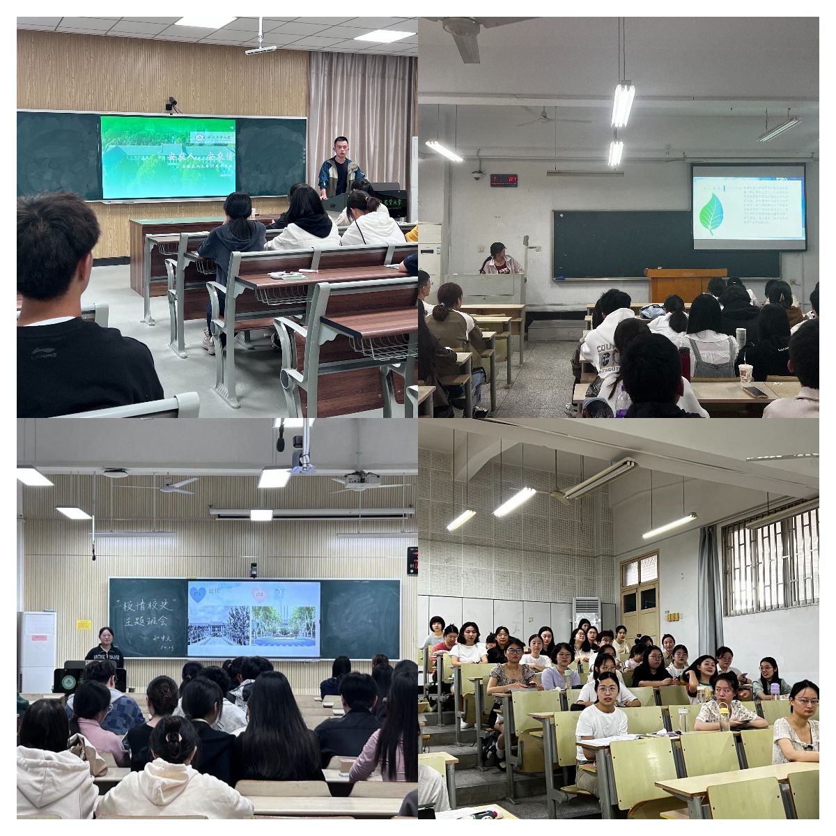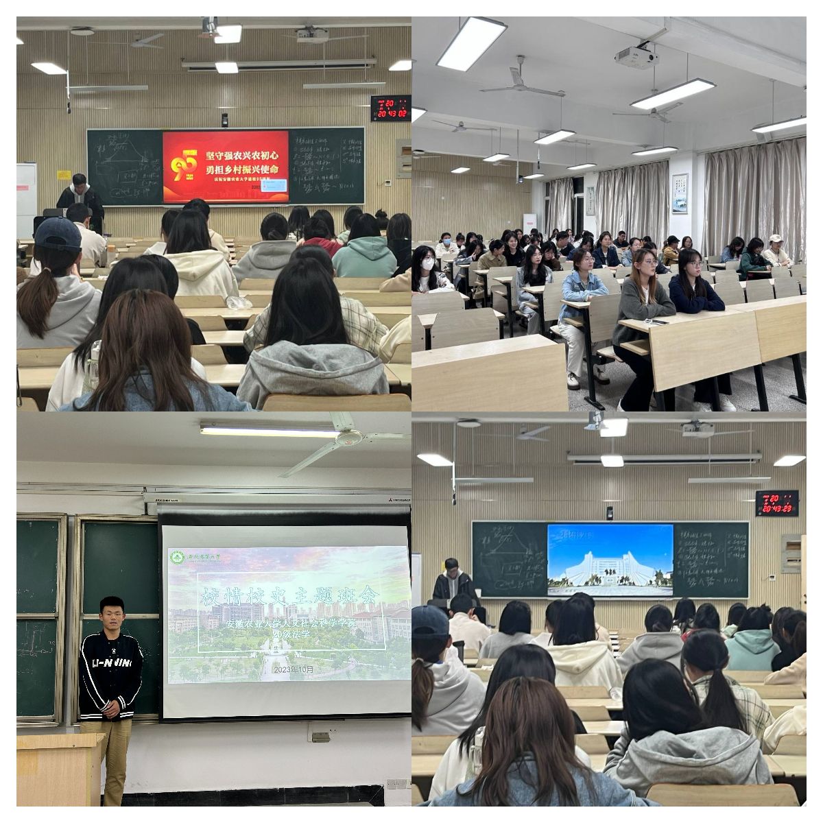 班会现场,辅导员通过ppt和图片材料先向学生讲解了校史沿革,通过介绍,同学们更加深入了解了安徽农业大学深厚的历史底蕴;随后辅导员通过视频介绍了农大前辈们为学校办学发展做出的巨大努力和贡献,让同学们在感怀安农大故事的过程中继承使命,接续奋斗;随后各专业年级以“个人成长与农大发展的关系”为主题进行讨论,同学们纷纷表示,作为农大人,应在优秀老师、校友的影响下明确个人目标,提高综合素质和能力,将个人发展和学校发展结合起来,实现人生价值;最后,辅导员向全体学生发起倡议,希望大家能用诗歌、绘画、图片、视频等方式表达对学校的热爱与祝福,展现对学校未来的美好祝愿。主题班会期间,学院组织部分班级分批次开展了参观校史馆活动。