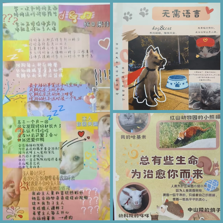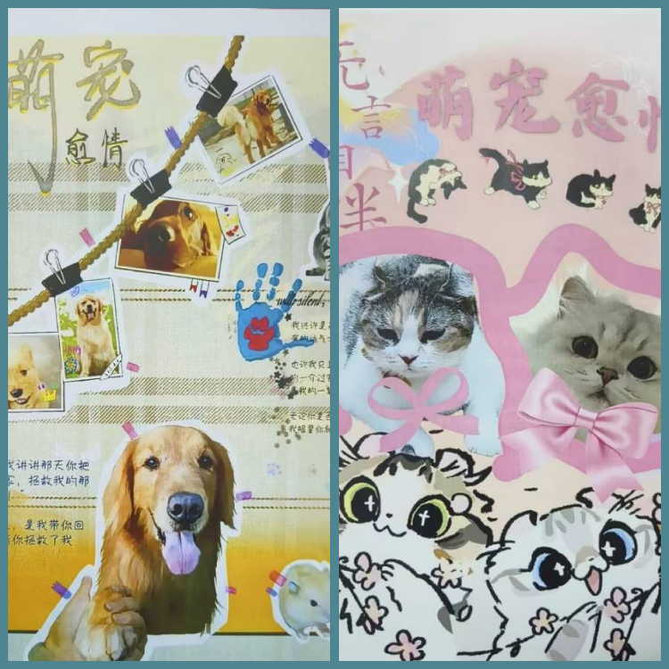 各位参赛同学以“我”与萌宠的照片、“我”与萌宠的故事等材料为基础,充分发挥想象力与创造力,制作出一副副精美的电子海报。在海报制作的过程中,参赛同学们通过分享自己与身边萌宠的暖心故事,鼓励更多同学可以敞开心扉,切身感受小动物陪伴带来的温暖,尝试寻找释放压力的方式方法。