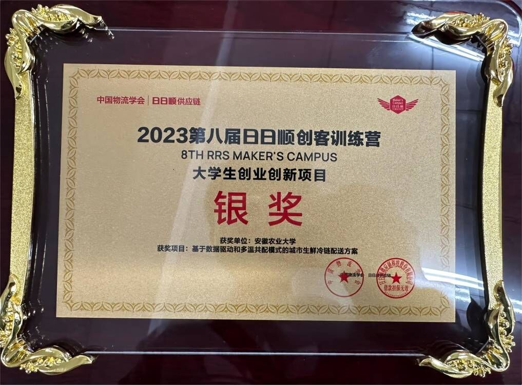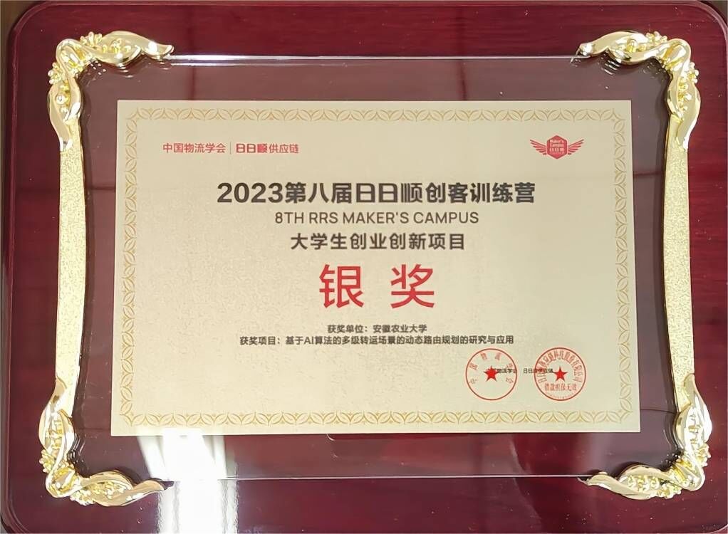 中国物流学会与日日顺供应链联合主办的“追光而创,青春有为”2023第八届日日顺创客训练营全国总决赛10月18日落下帷幕,安徽农业大学信息与人工智能学院物流工程专业的李梦茹团队、洪扬团队不负众望,凭借创业课题《基于数据驱动和多温共配模式的城市生鲜冷链配送方案》、《基于AI算法的多级转运场景的动态路由规划的研究与应用》两项创业课题斩获全国银奖2项,并获得创业启动基金2万元,指导老师叶勇、高羽佳被授予“卓越导师”荣誉称号。