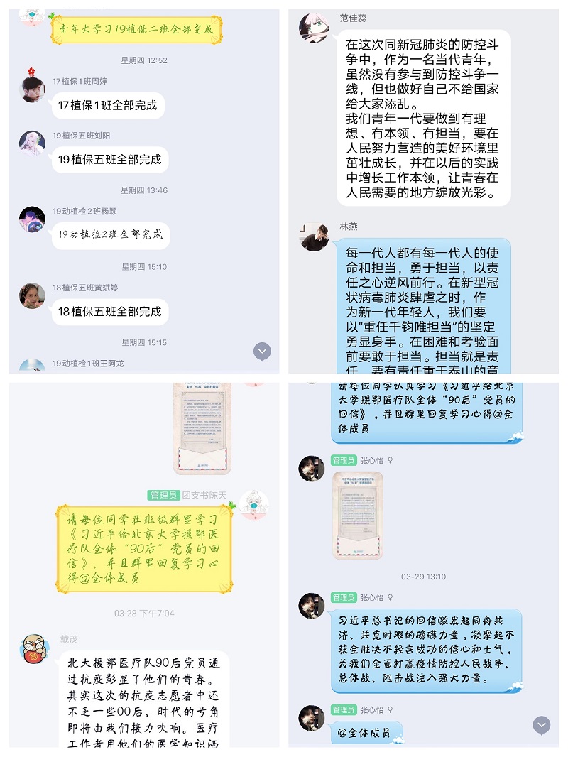 自“青年大学习”网上主题团课第八季开课以来,学院各支部加强团课学习,不断强化青年思想理论武装。辅导员依托QQ群和微信群,围绕习近平总书记给北京大学援鄂医疗队全体“90后”党员的回信精神,组织开展主题班会,引导学生认真学习、思考和交流。在疫情面前,同学们深刻体会到党的卓越领导力和国家的强大凝聚力,切身感受到中国特色社会主义集中力量办大事的制度优势,尽情抒发爱国热情和报国之志,不断把学习激发的热情转化为线上学习和线下社会实践、志愿服务的实际行动。