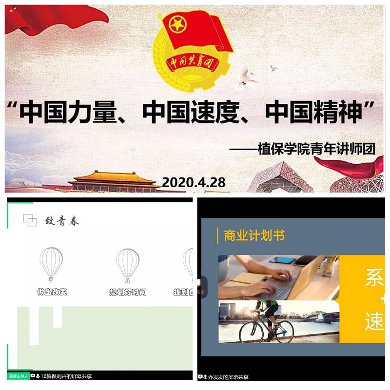 学院团委把疫情防控阻击战作为加强广大团员青年思想教育的生动教科书,开展青年大宣讲活动。4月28日,学院在腾讯会议室开展“青春成长沙龙”第一期活动,院青马班学员及青年团员近300人在云端参加活动。学院青年讲师团开展“中国力量、中国速度、中国精神”宣讲,帮助青年知兴替、铭责任、勇担当、明未来、感党恩,进一步树牢制度自信。2016级优秀毕业生同学刘卉、乔慧君通过分享自己学业生涯规划、科技创新竞赛、社会实践拓展等,鼓励学弟学妹努力学习专业知识,牢记“植保人”初心和使命。
